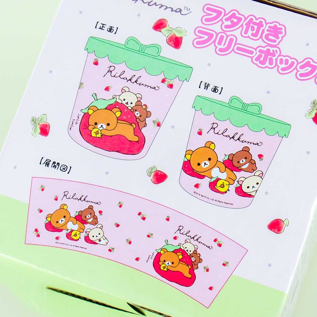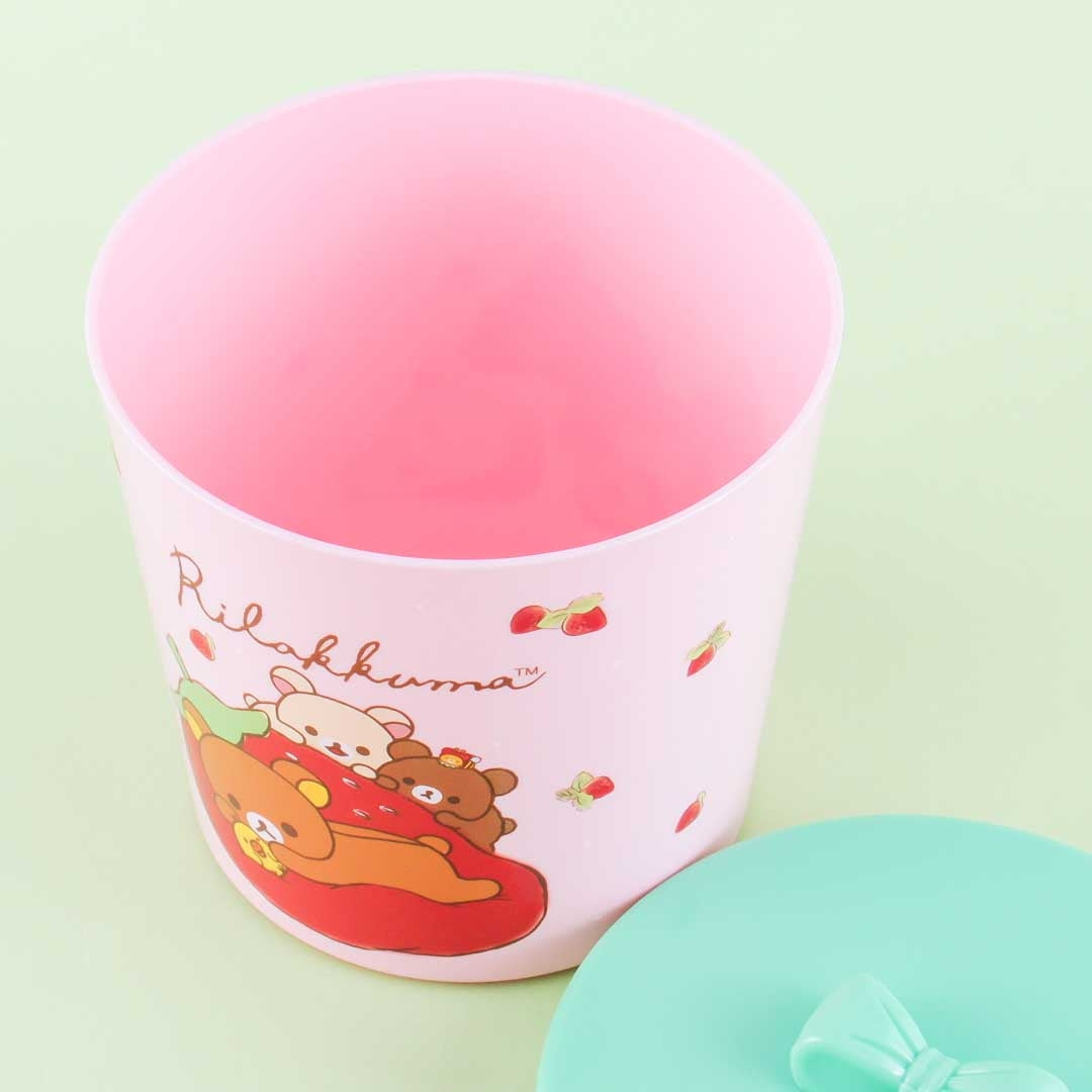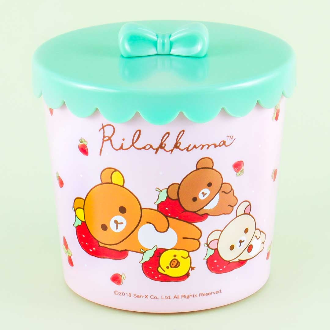 A kawaii canister covered in prints of Rilakkuma characters lying down on strawberry pillows