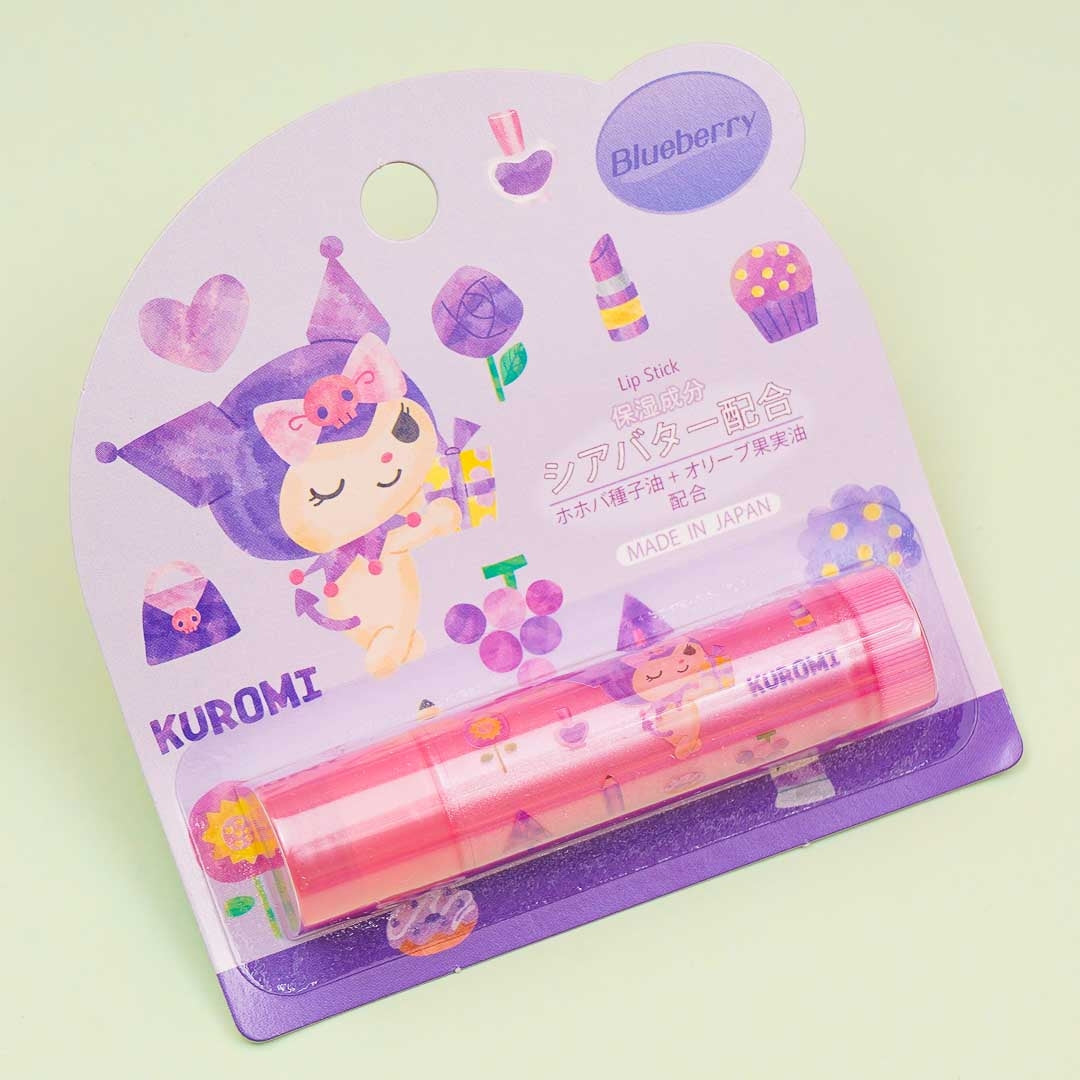 This stick of blueberry-scented lip balm features a print of Kuromi carrying a present! Use it to keep your lips nice and soft. It's made of moisturizing ingredients like shea butter, olive fruit oil, and jojoba seed oil.