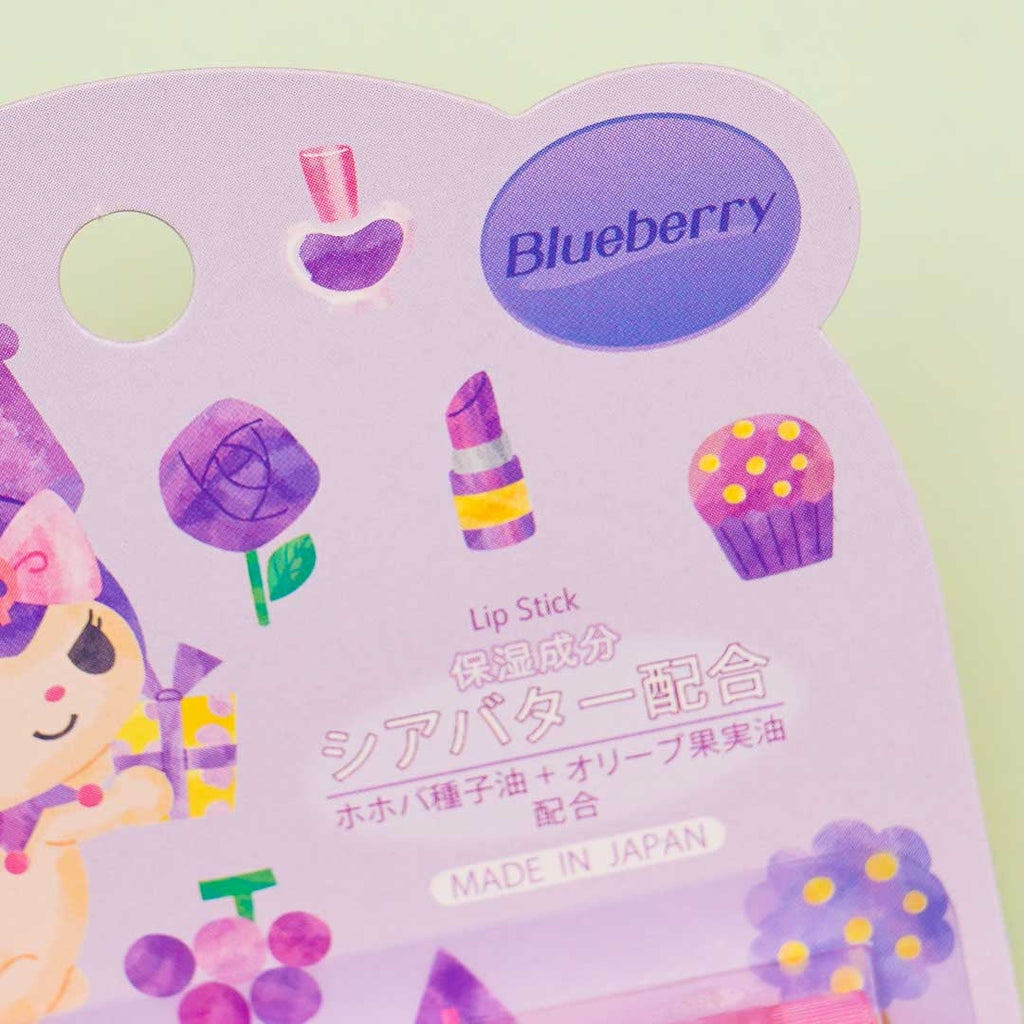 A kawaii stick of blueberry-scented lip balm illustrated with Kuromi carrying around a present