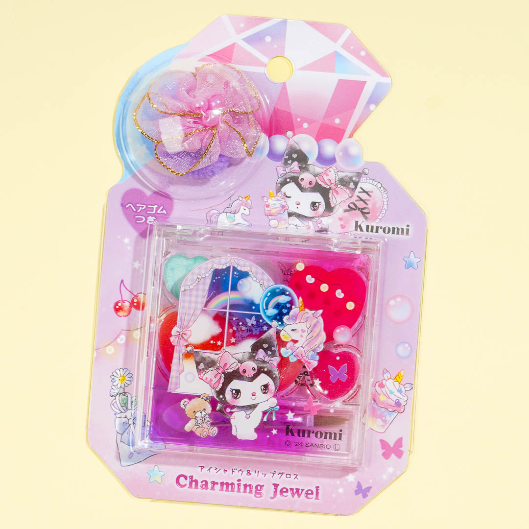 It's time to practice different makeup looks using this mini palette! It has three shimmery eyeshadow colors and three lip gloss shades in cute heart-shaped pans. This palette features cute prints of Kuromi looking like a pretty doll. It also comes with a mini hair tie to complete your kawaii look!
