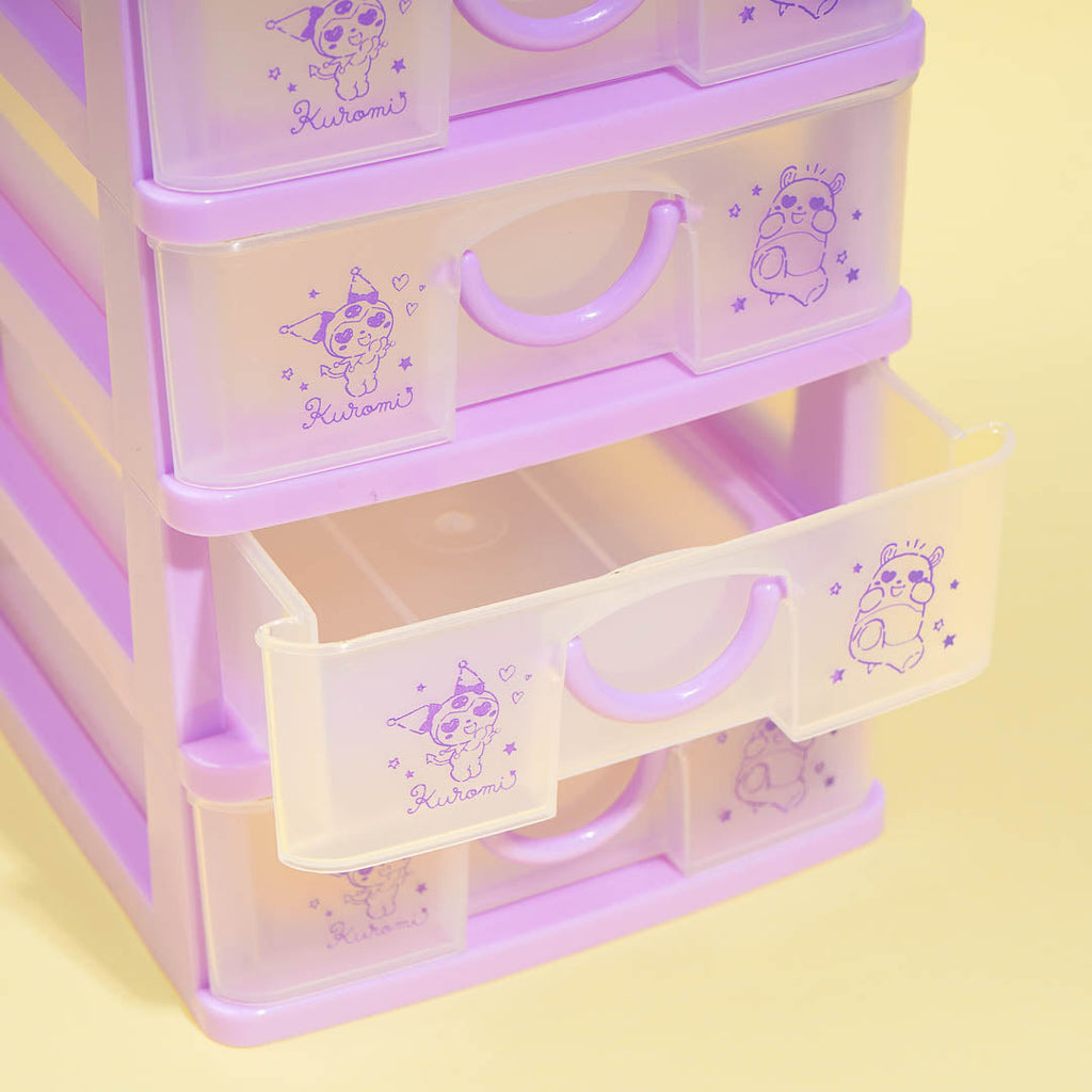This kawaii desk drawer showcases Kuromi riding on top of her friend Baku! It has four different drawers and a top layer with multiple compartments. You can use this drawer to sort out the things on your desk like your makeup brushes, hair ties, charms, and more.
