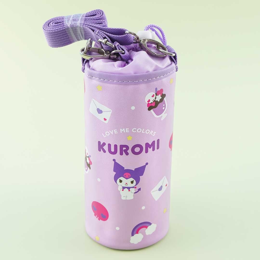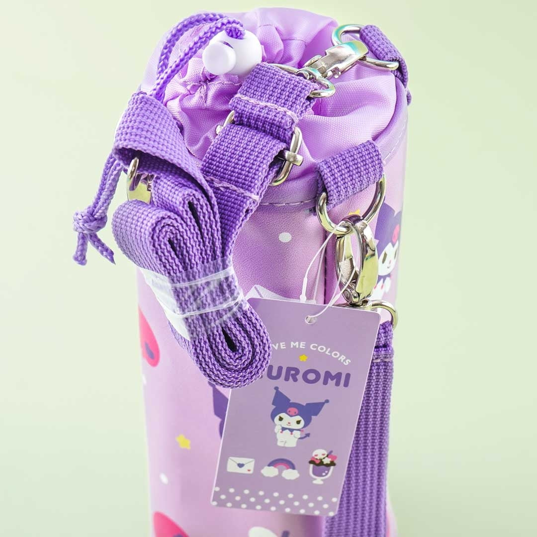 This super kawaii bottle case is covered in prints of Kuromi with letters, drinks, and other cute things. Use it to bring your water bottle! It has a detachable strap, an inner aluminum lining to help keep your drink cool or warm, and a drawstring closure with a cord lock.