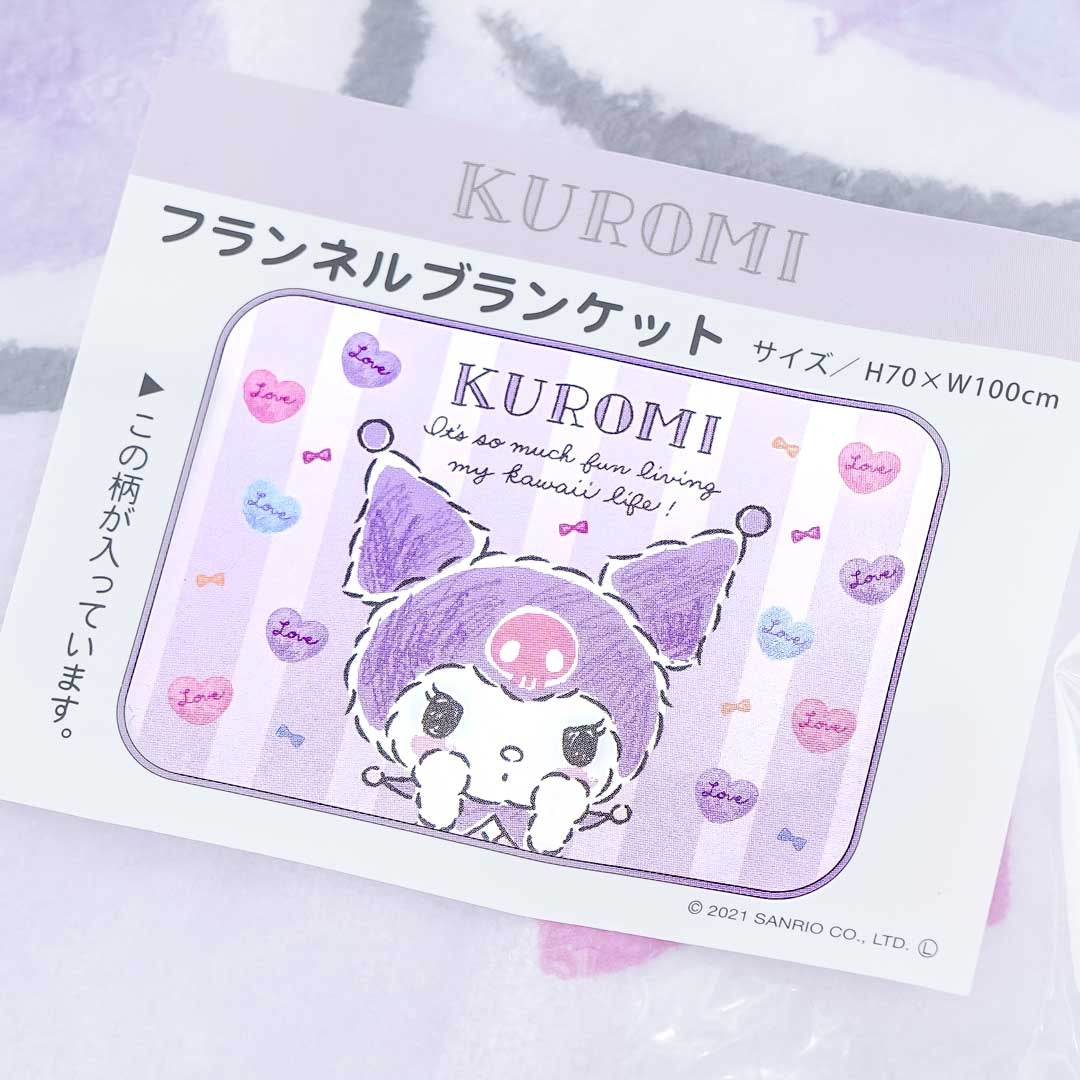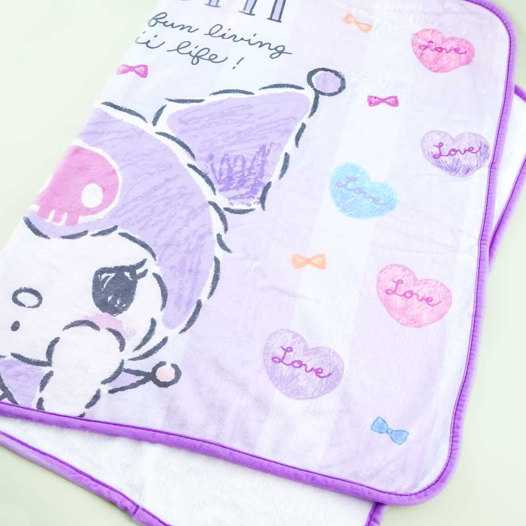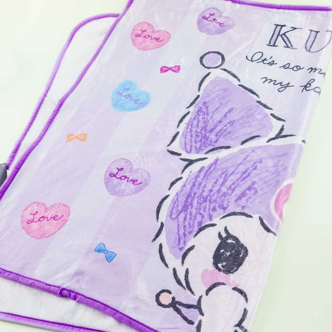 Spend the cold winter days indoors by snuggling with this cute flannel blanket! It features prints of Kuromi surrounded by pastel-colored hearts! This polyester blanket has a soft, silk-like texture which makes it very comfortable!