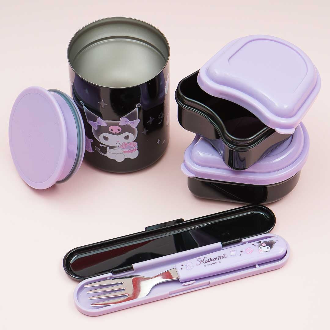 Have a blast creating character bento inside this super cute lunch box set featuring Kuromi. It comes with a stainless heat-retaining jar, dome-shaped vegetable containers, a fork with a case, and a lunch bag. The vegetable containers are stackable and are also microwave-safe, just remember to remove the lids.