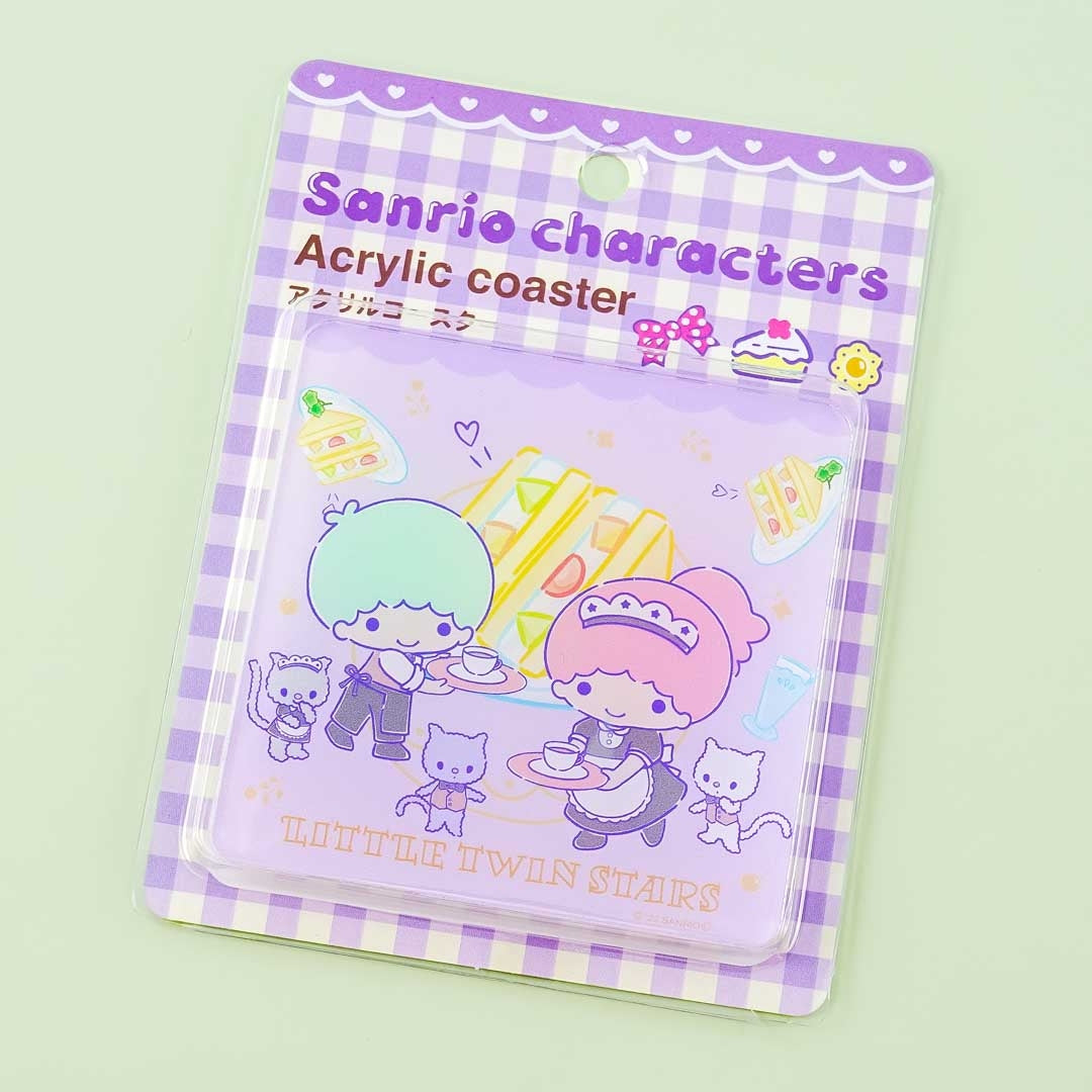 Use this acrylic coaster to keep water stains off your table. It showcases the Little Twin Stars serving at a cafe with fruit sandwiches!