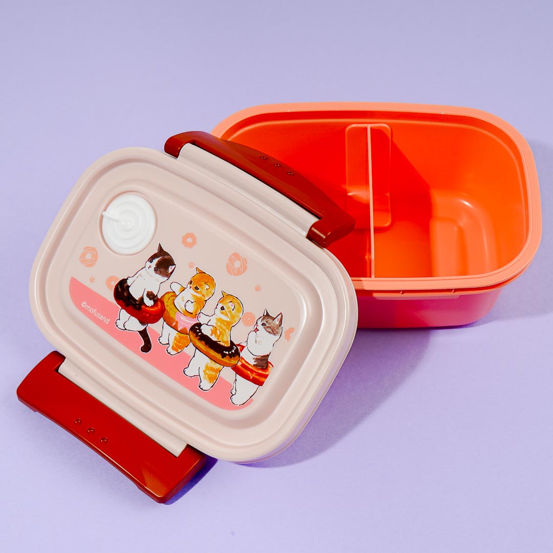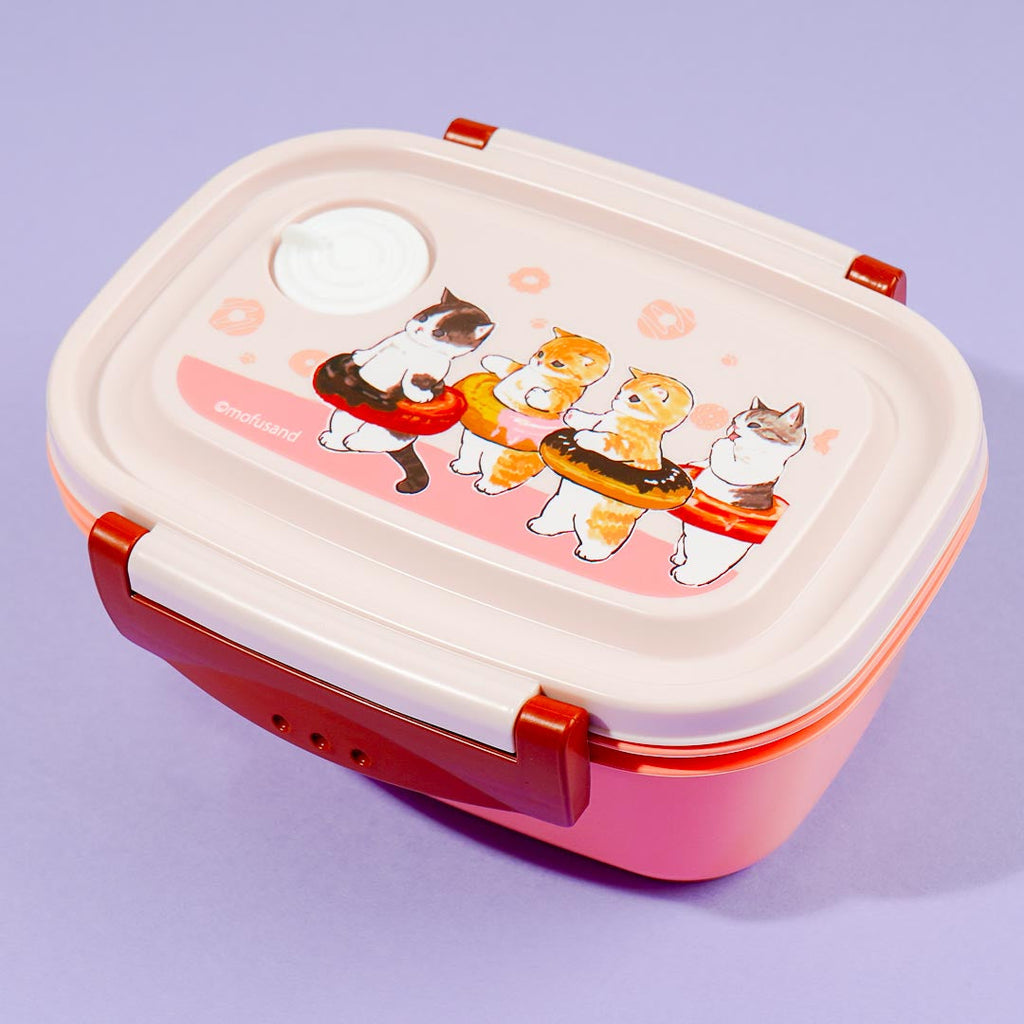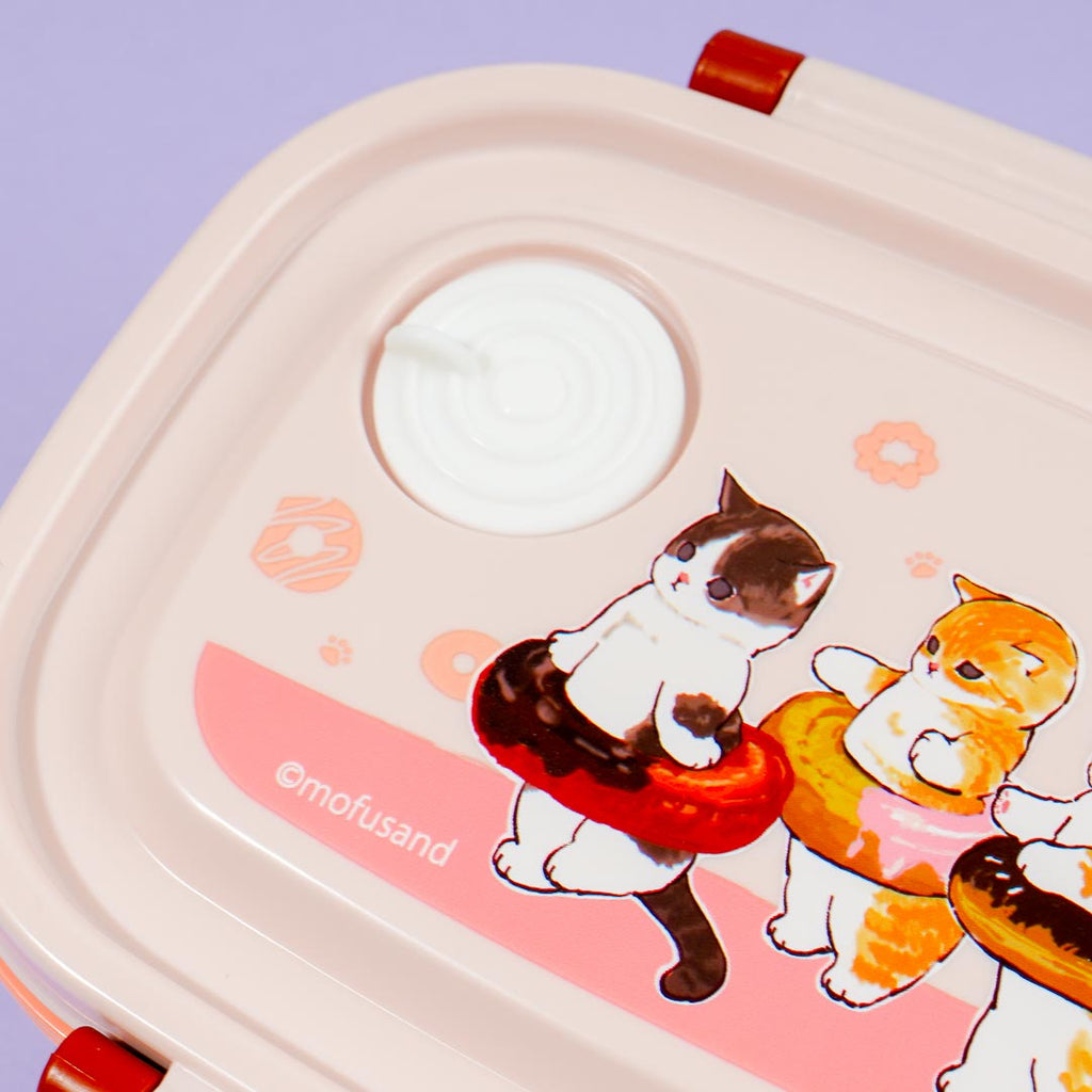 Take this kawaii lunchbox to your next picnic! The main lid has dual side locks and is decorated with prints of cute cats wearing swim rings that looked like donuts! This bento box also has an air vent on the top