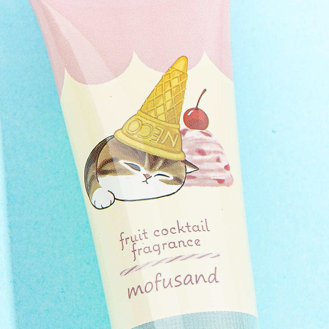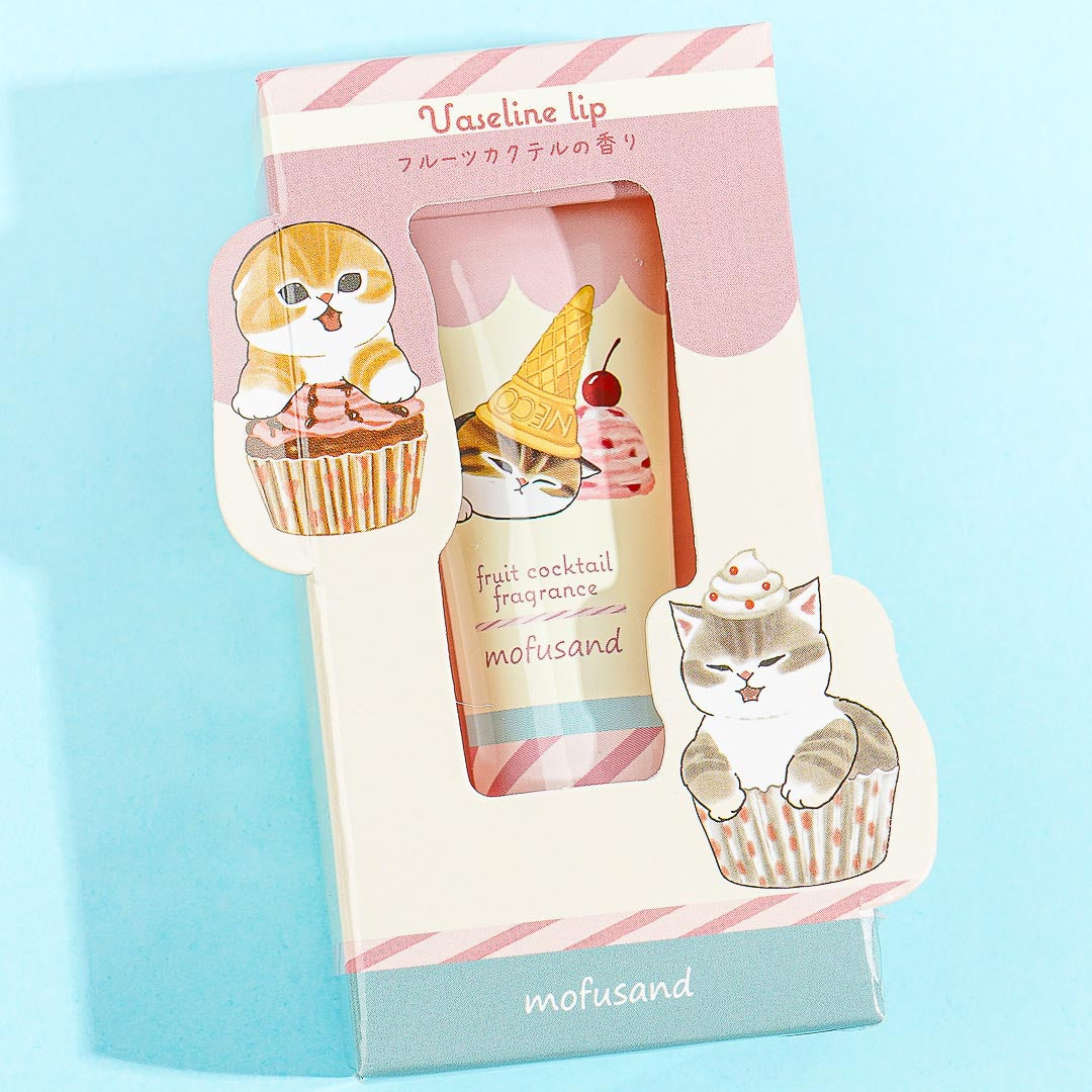 Add this tube of vaseline lip gloss to your beauty kit. It showcases a print of a happy Mofusand cat sleeping with an ice cream cone on its head! This lip gloss has a lovely fruit cocktail scent.