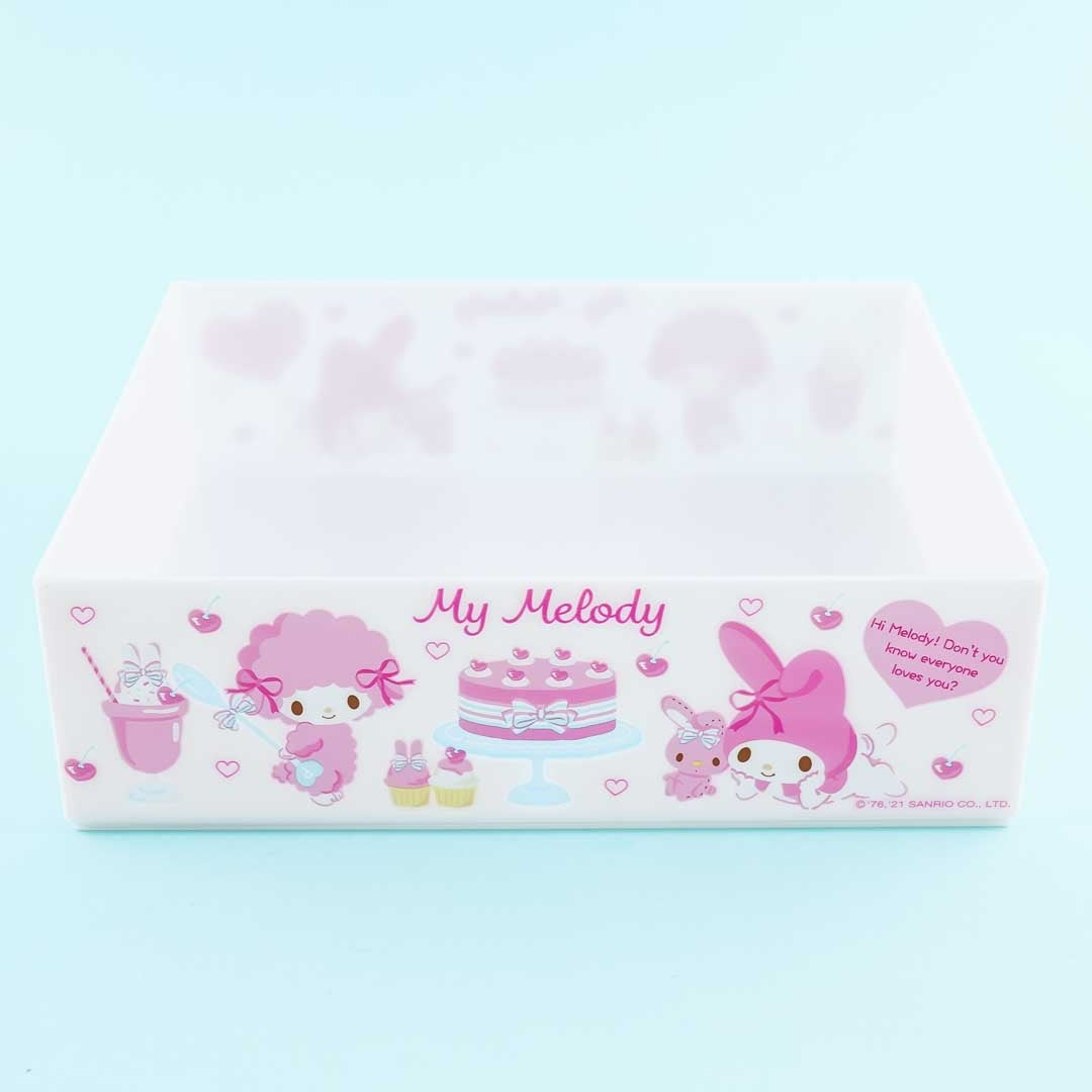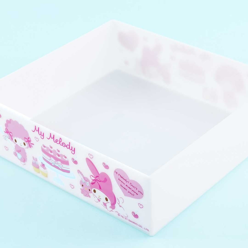 Organize your markers, crayons, paints, and other coloring materials in this kawaii resin container! The medium-sized box comes without a lid and is decorated with prints of My Melody, My Sweet Piano, and their pink rabbit friend while eating desserts together! You can stack this super cute storage case on top of other boxes from the same series.
