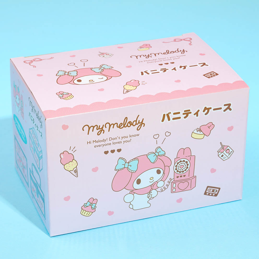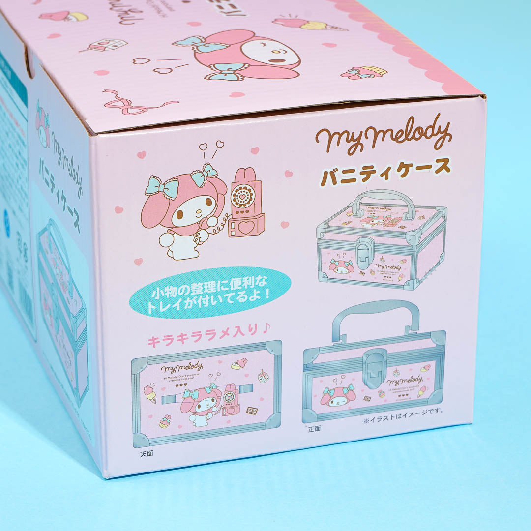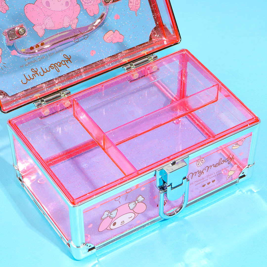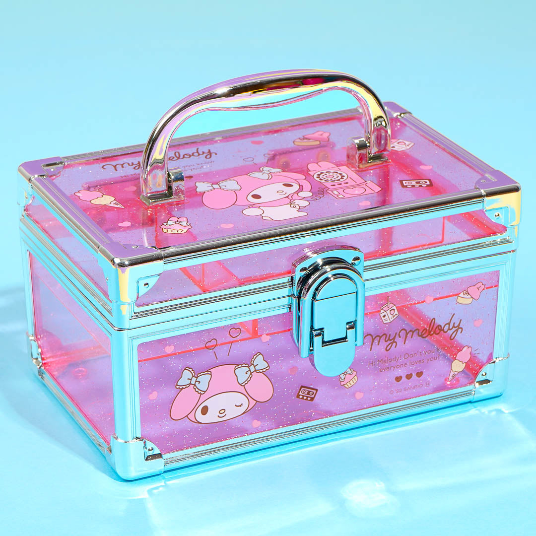 Store makeup, brushes, and other beauty items inside this vanity case. This kawaii clear glittery case showcases prints of My Melody surrounded by cute things like ice cream, clocks, and more! It has a removable tray with multiple compartments. You can easily bring it around thanks to its nifty handle!
