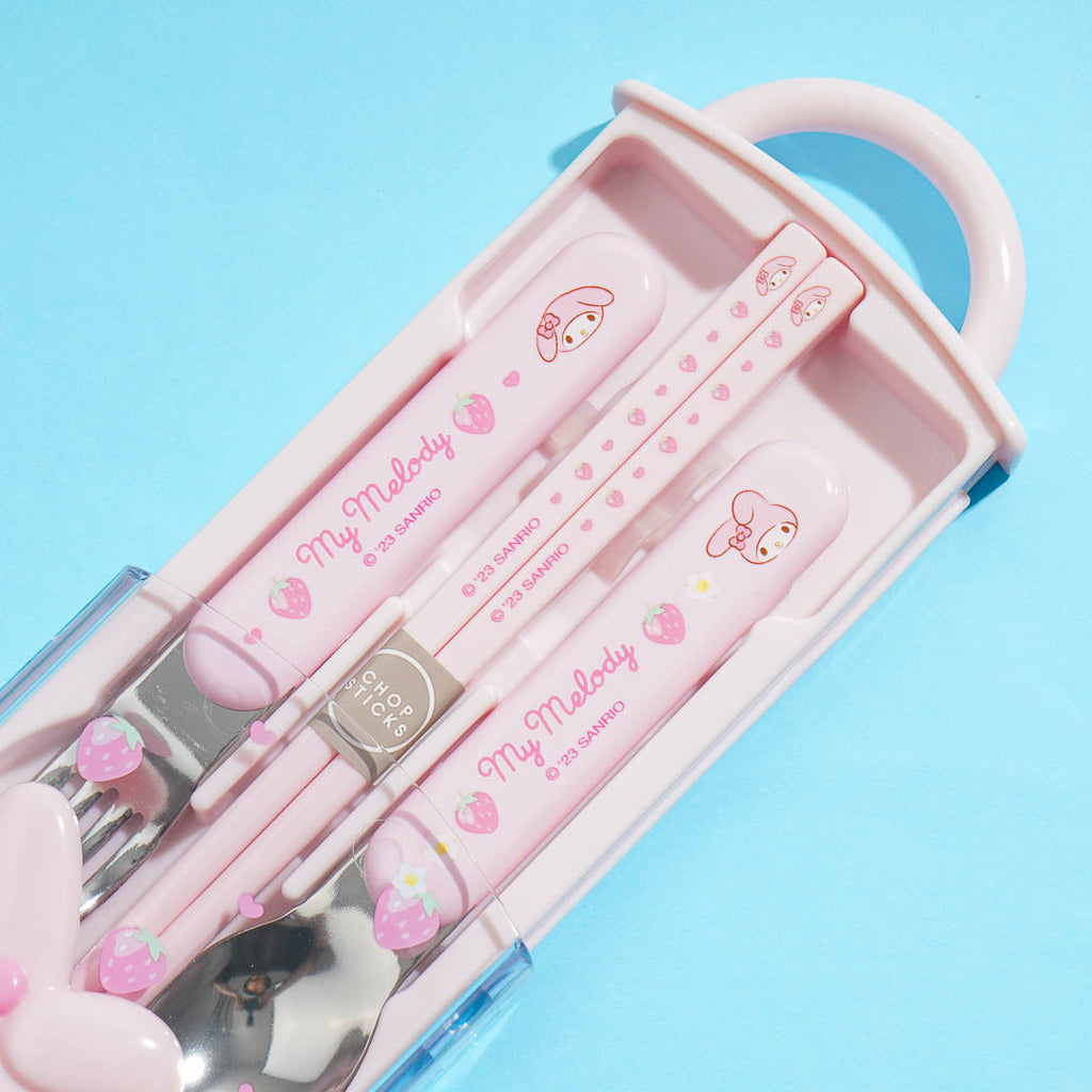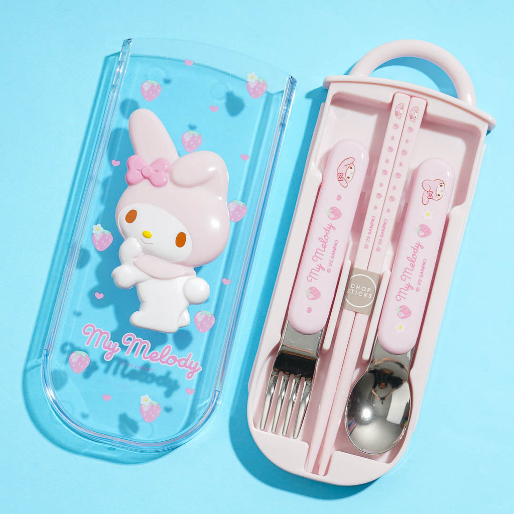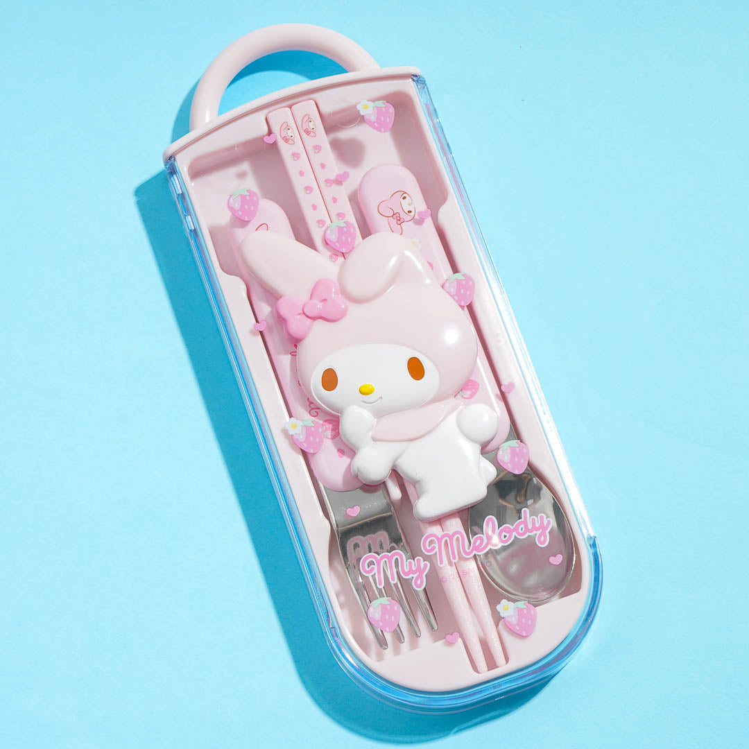 Bring this kawaii utensil set to school! It features cute illustrations of My Melody and strawberries. The case even has a 3D My Melody decor and a handle so you can easily carry it!