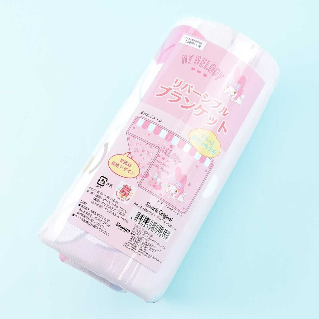 A kawaii reversible blanket with illustrations of My Melody with her friends and strawberries