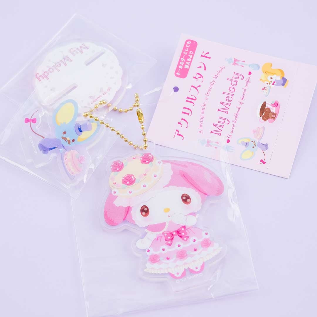 Use this super kawaii stand set to decorate your desk. It features My Melody wearing a rose-themed outfit with a mouse friend holding up a rosy cake! This stand set comes with a removable ball chain to help keep all the parts together. You can also use it to attach it to your favorite bag!
