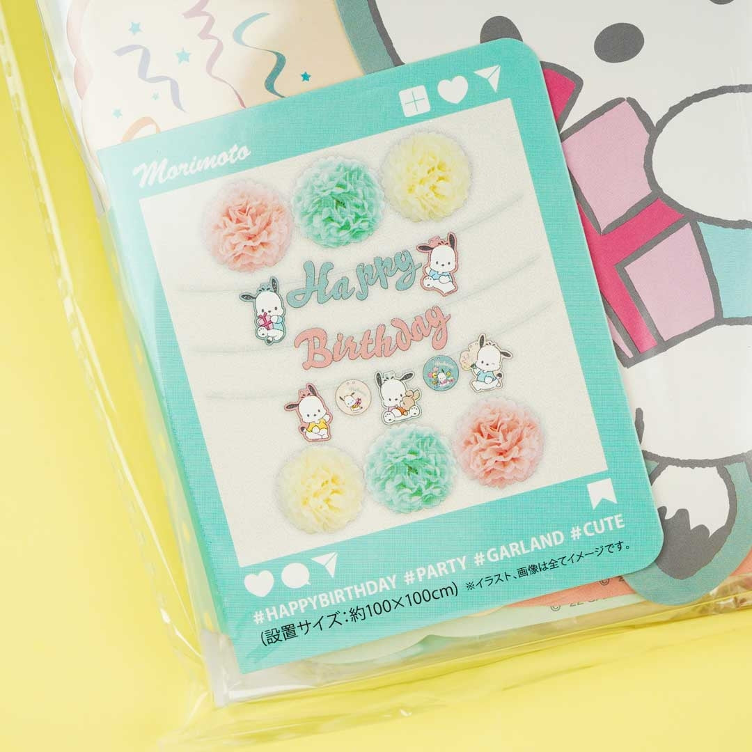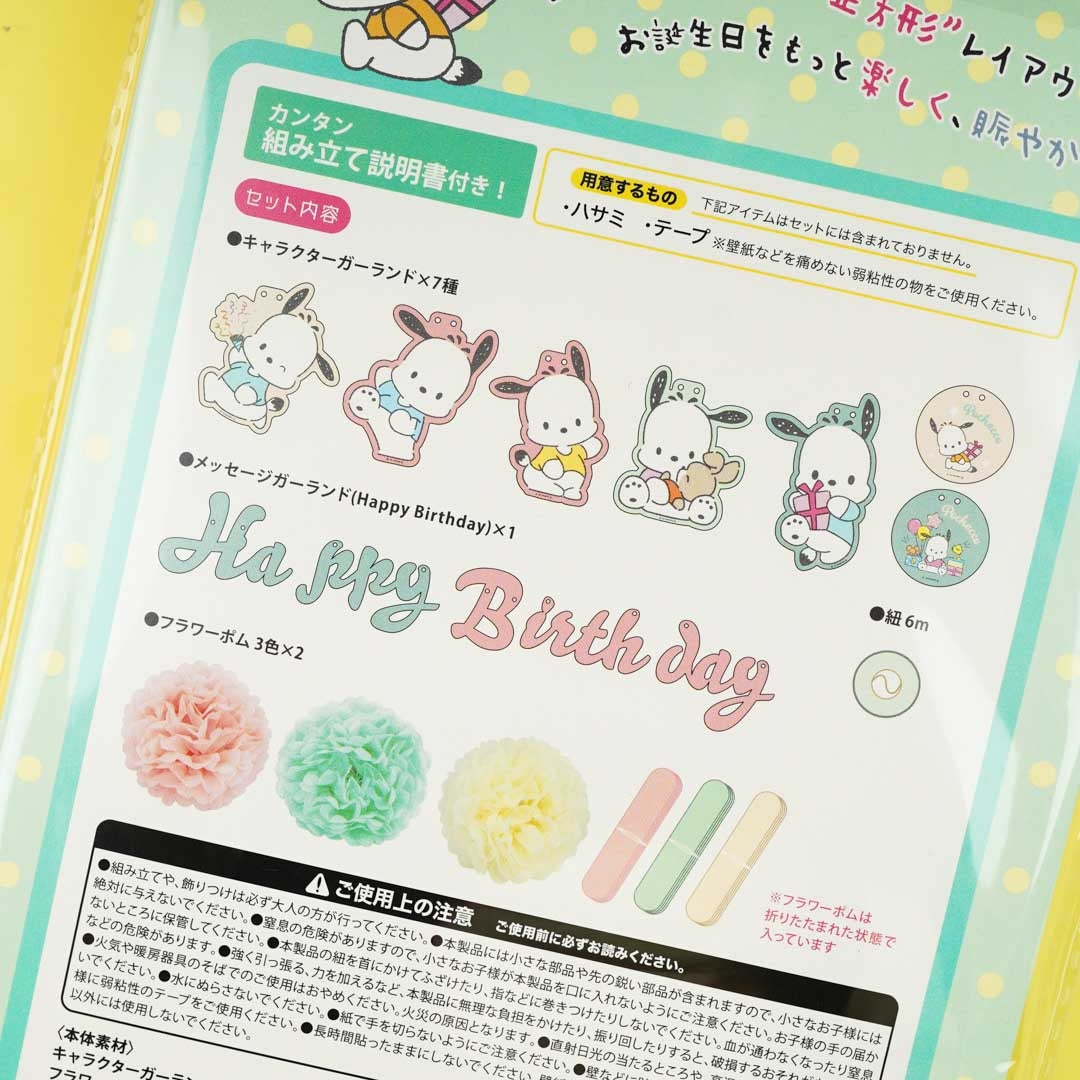 Includes: die-cut Pochacco and letter garlands, 6 x paper flower pompoms, and 3 x polyester strings