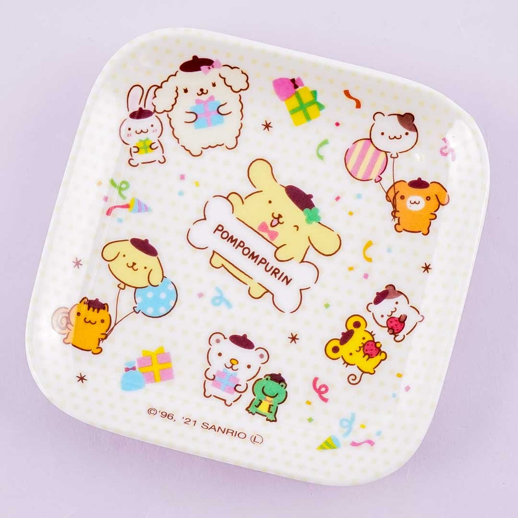 • A cute small square plate illustrated with Pompompurin and his friends at a party
