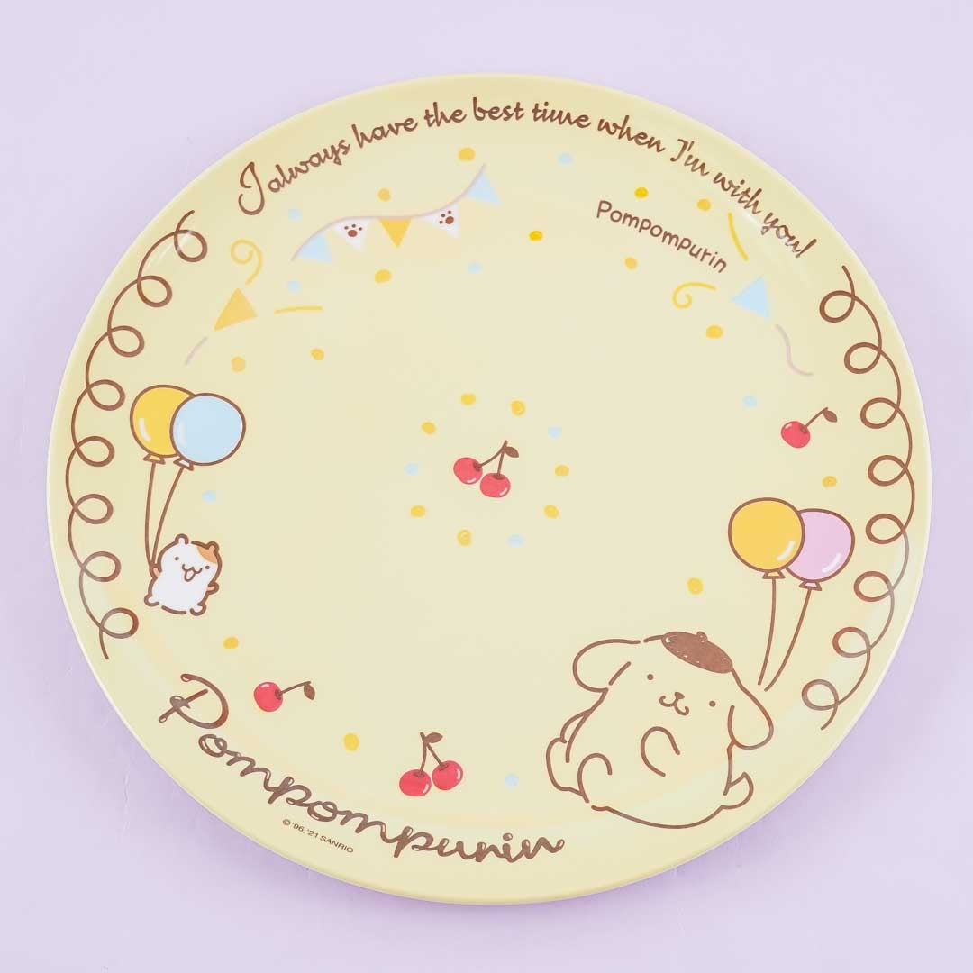 A round plate with illustrations of Pompomurin, Muffin, balloons, and cherries