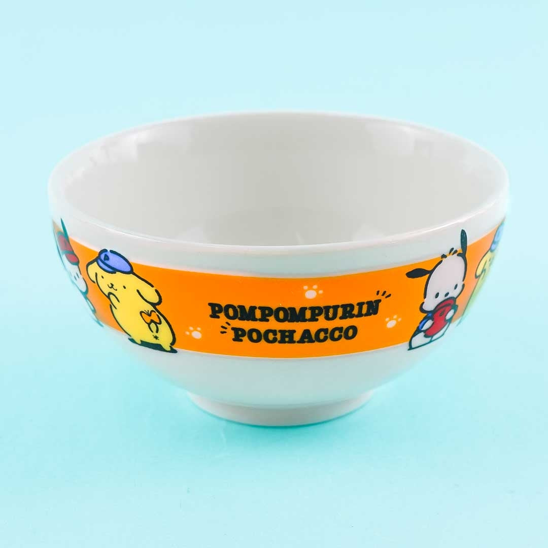 A super kawaii ceramic rice bowl illustrated with Pompompurin and Pochacco spending time together