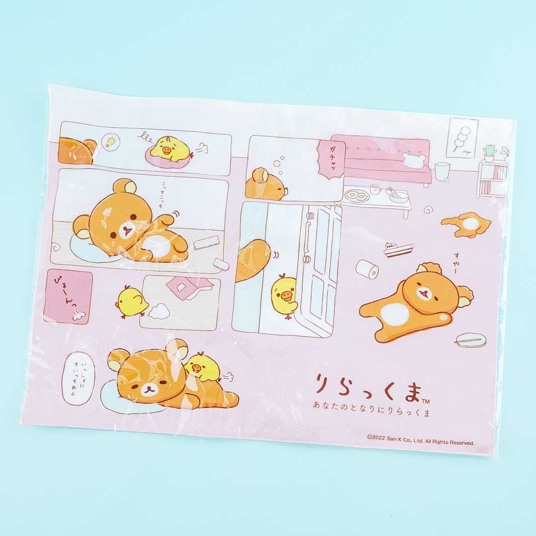 A super cute placemat with prints of a napping Rilakkuma and Kiiroitori