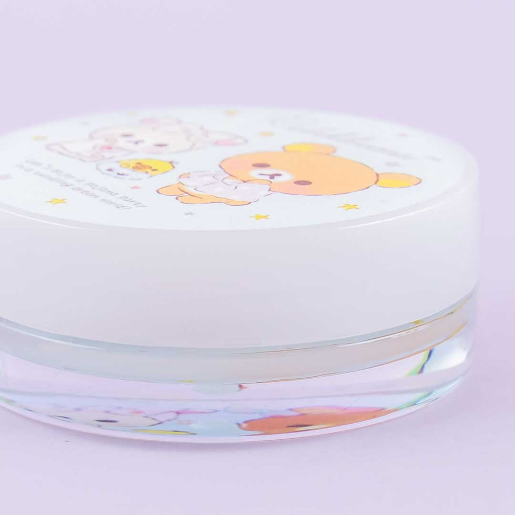 A moisturizing all-over lotion in a round case featuring Rilakkuma and friends in sleepwear