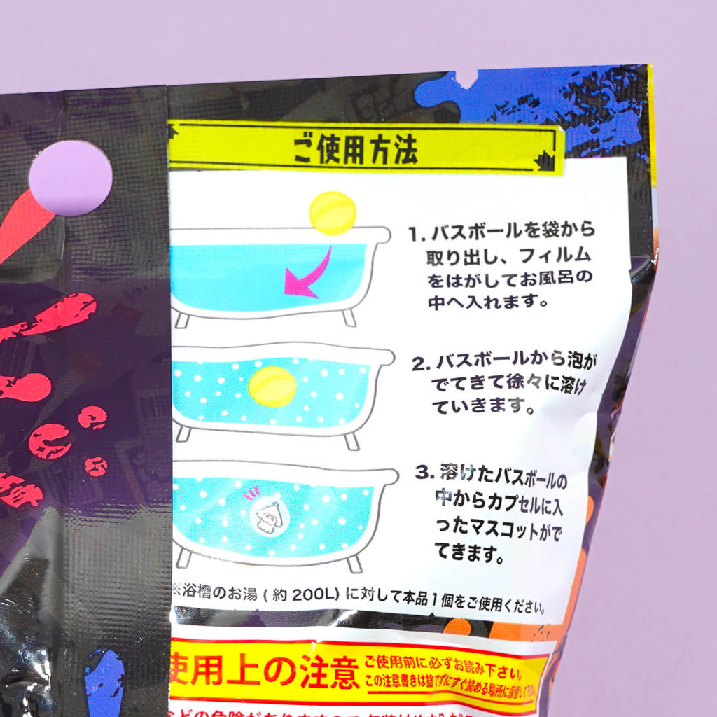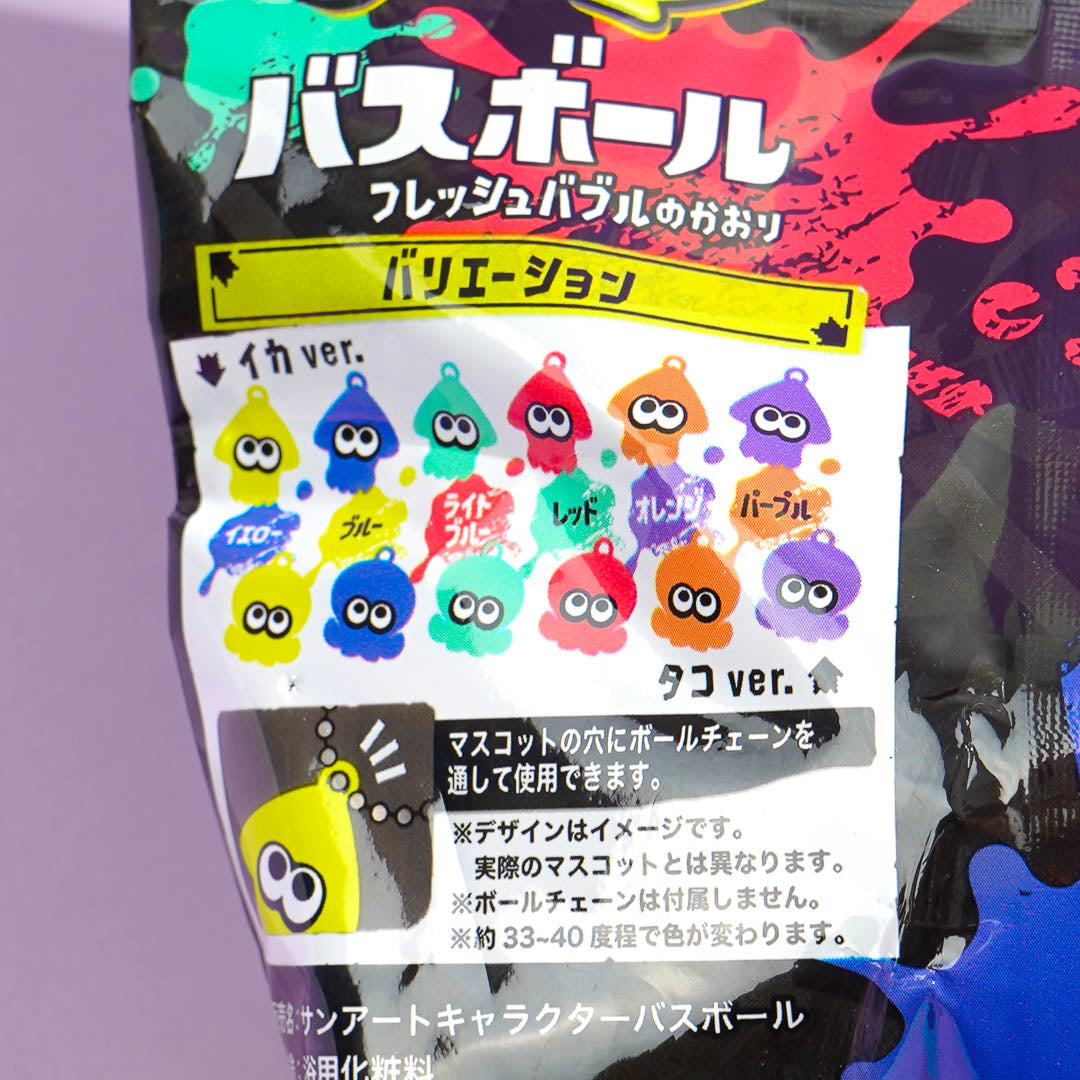 Play in the bath with this bath bomb. Once the bath ball melts in water you'll find yourself a cute Splatoon 3 collectible that changes color depending on the temperature! With hot water the collectible is white, with cold water it becomes either yellow, blue, teal, red, orange, or violet.