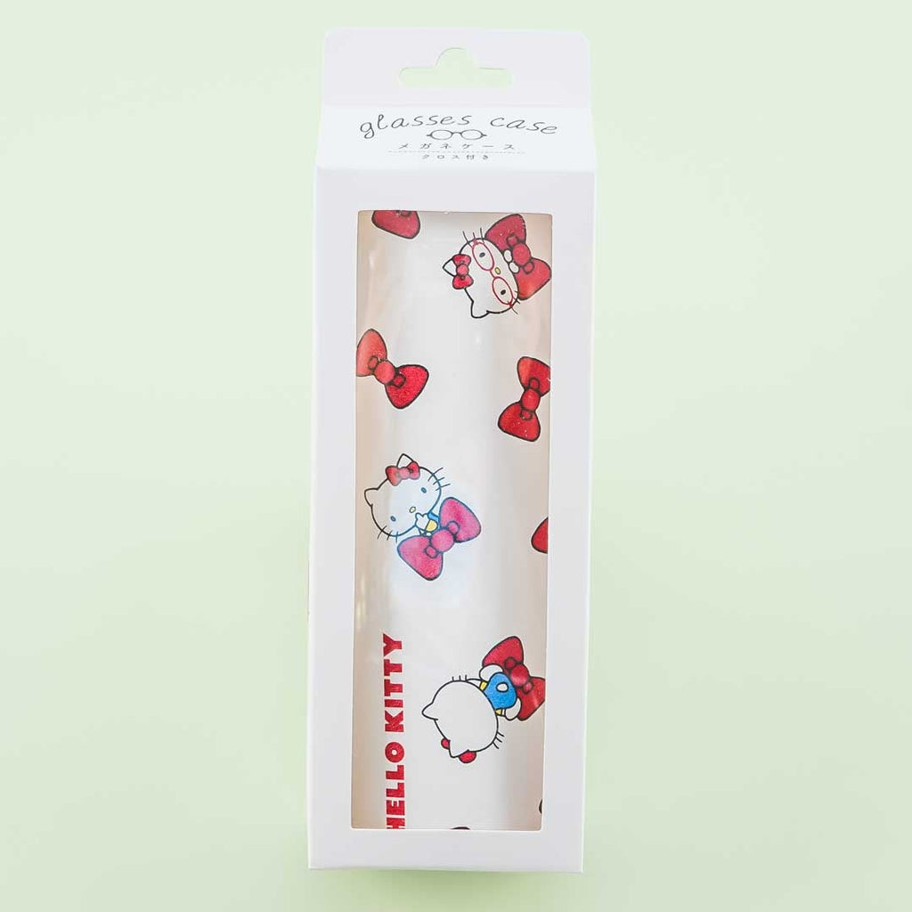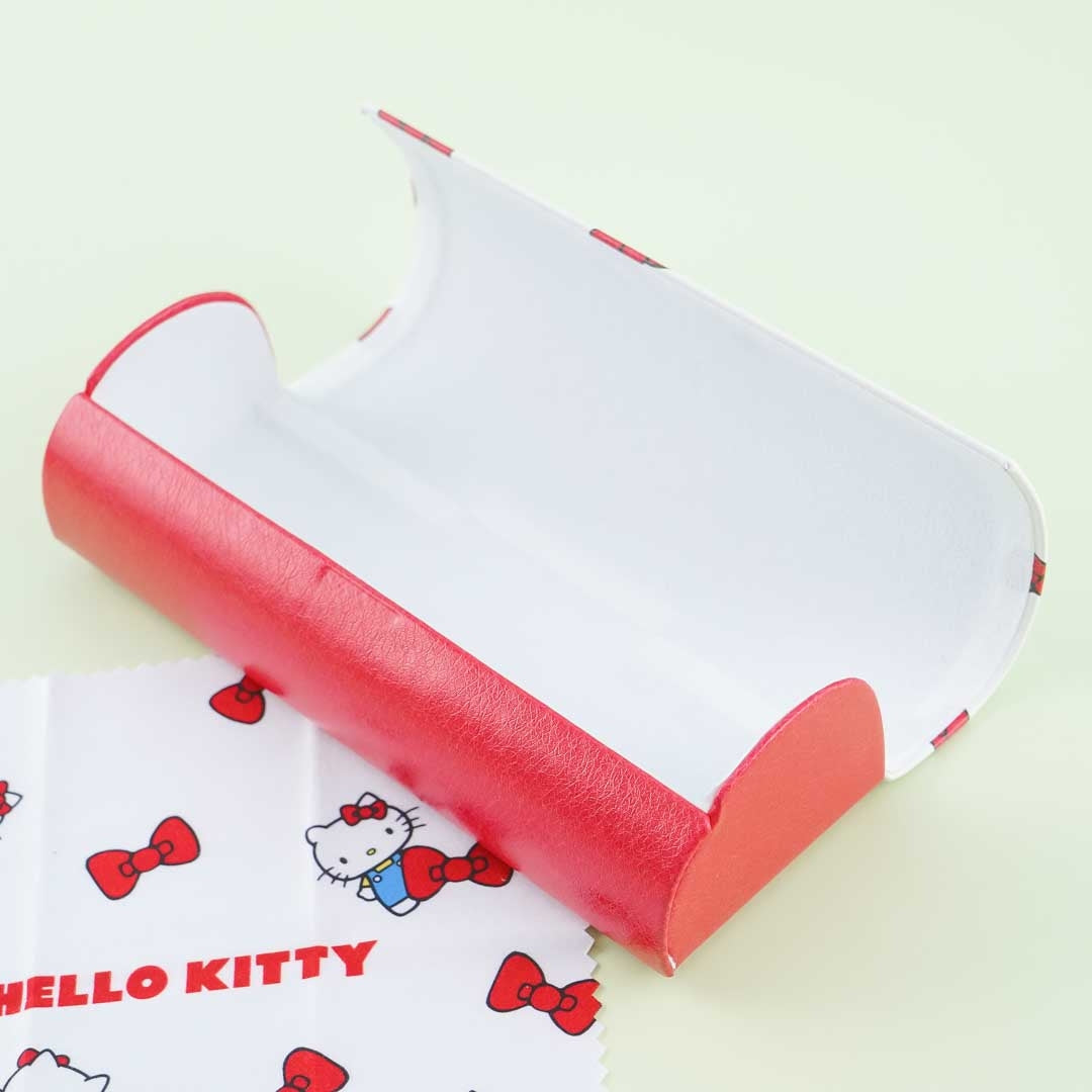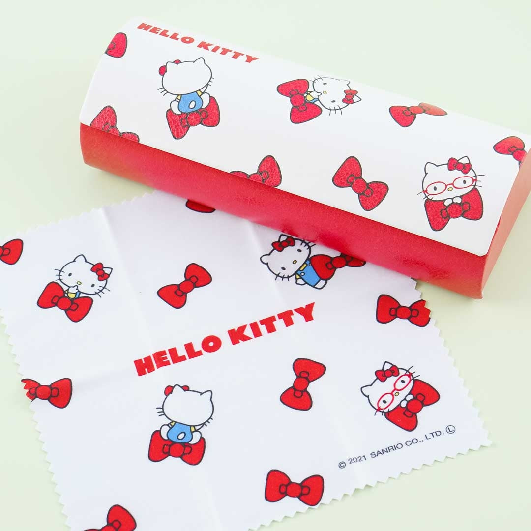 A super cute eyeglass hard case featuring illustrations of Hello Kitty and red ribbons