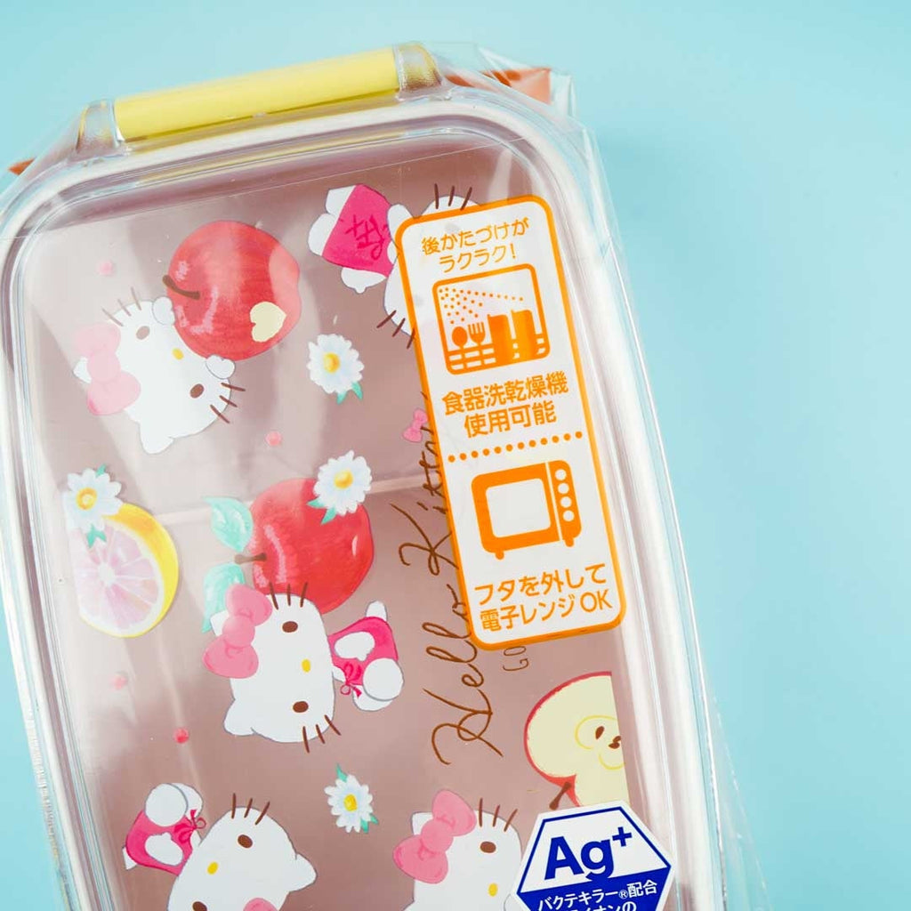 A cute bento box decorated with prints of Hello Kitty, apples, and citrus fruits