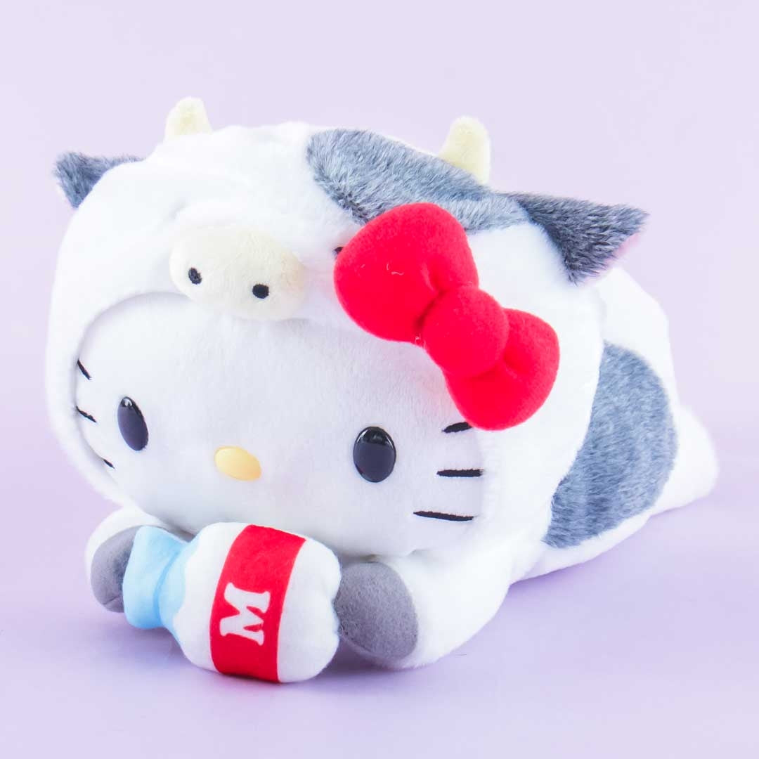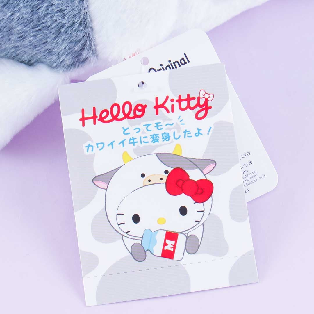 A super cute medium-sized Hello Kitty plushie wearing a cow onesie
