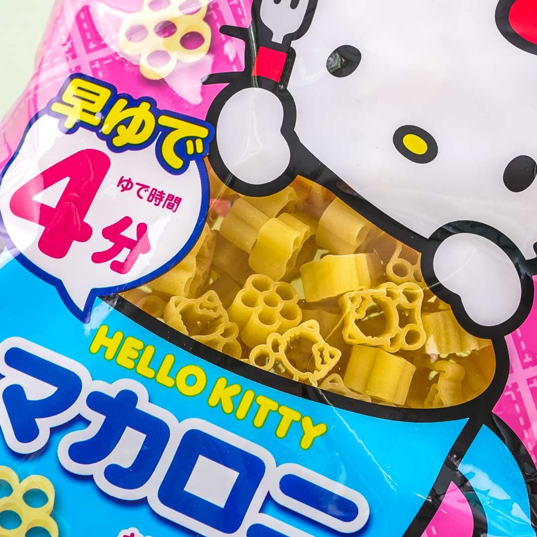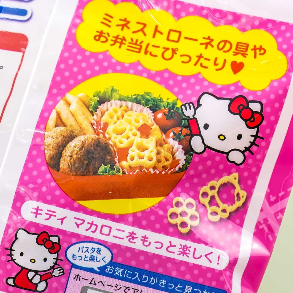 A pack of dried macaroni noodles shaped like Hello Kitty and flowers