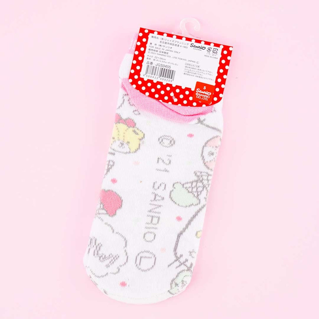 A super cute pair of socks decorated with illustrations of Hello Kitty