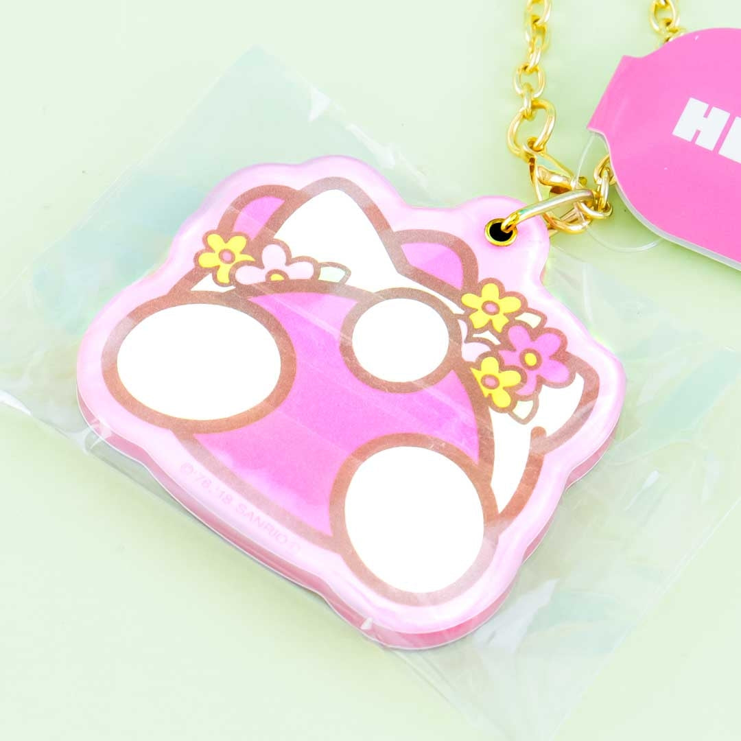 Attach this super kawaii Hello Kitty charm wearing a floral crown to your favorite backpack with its detachable chain! You can slide it open to reveal a mirror that you can use.