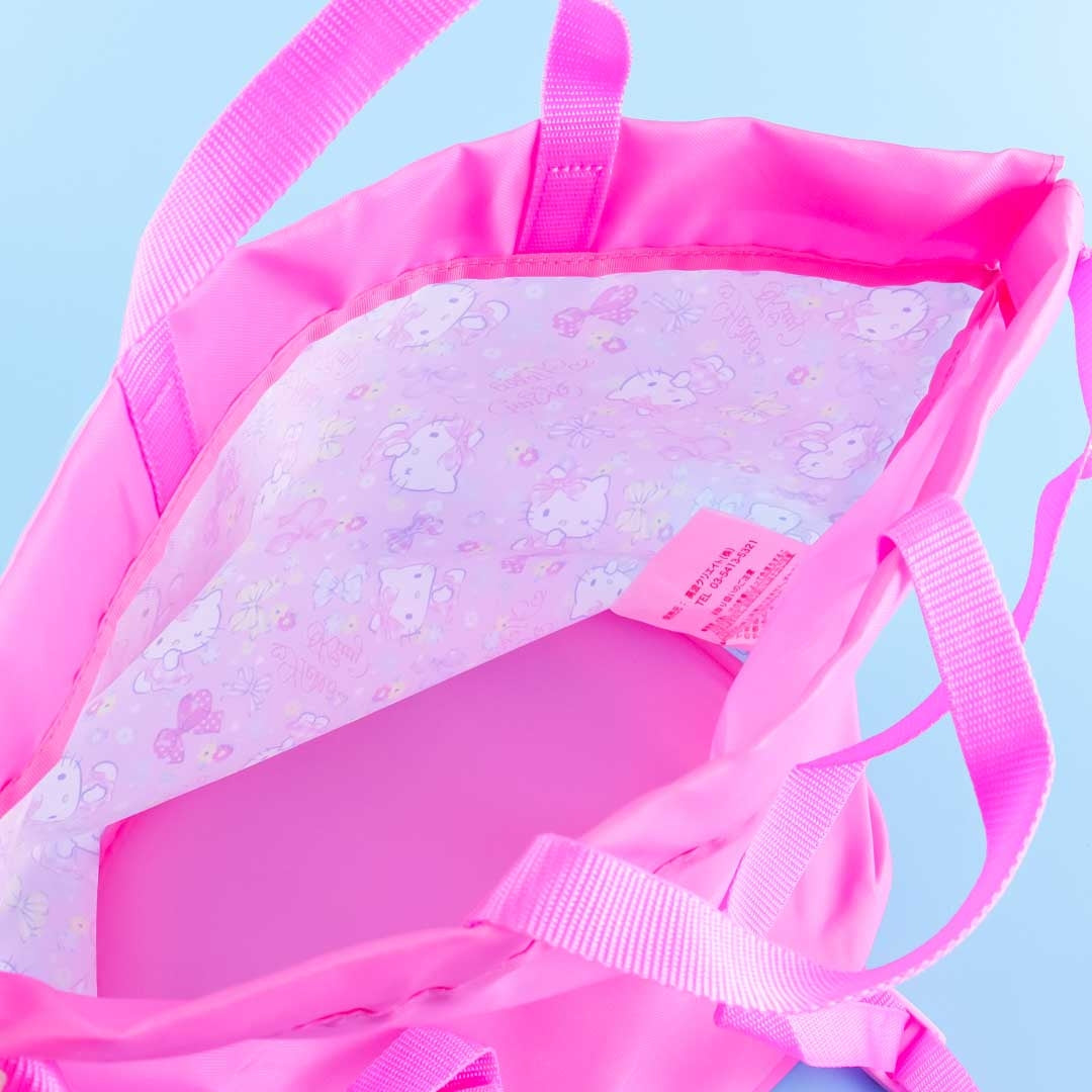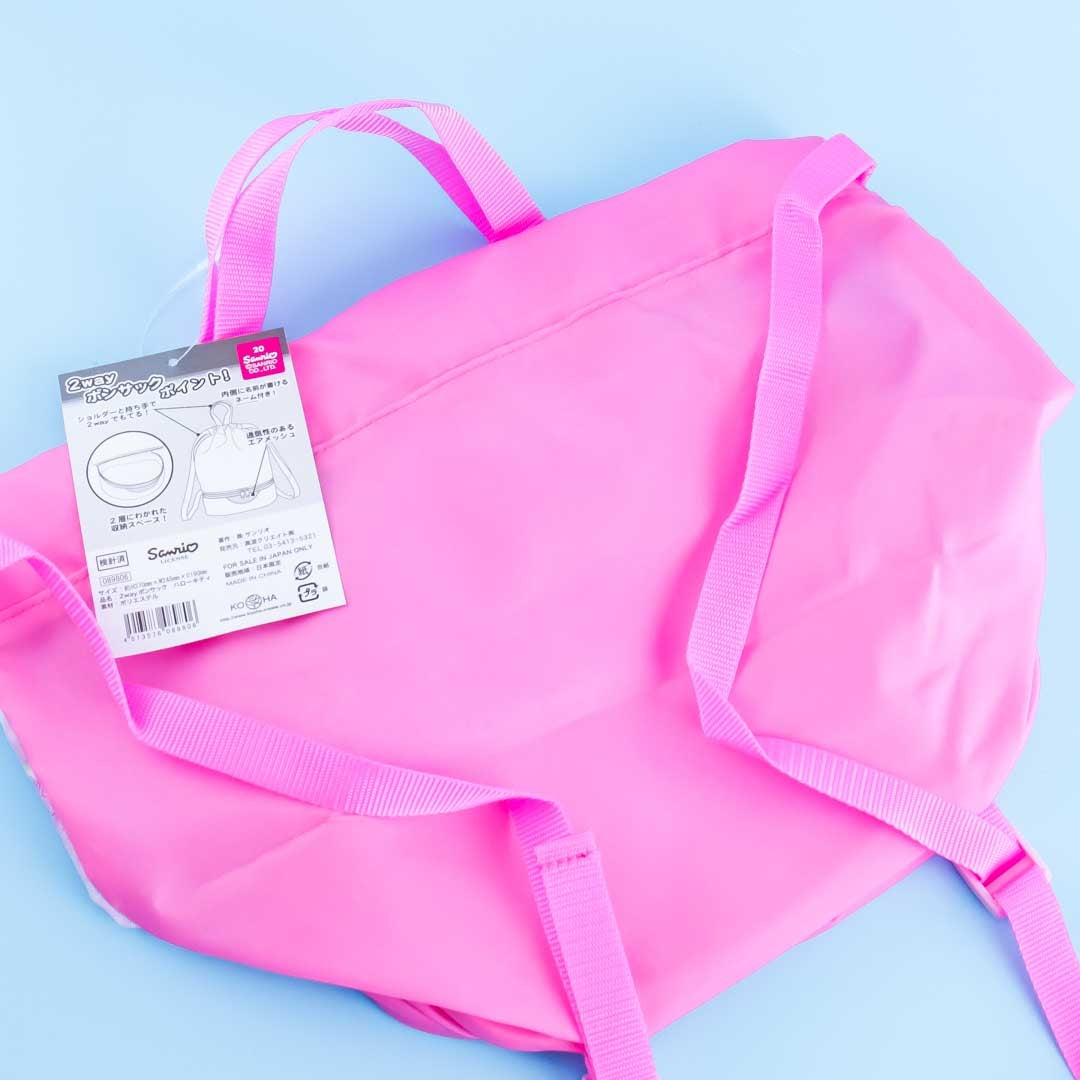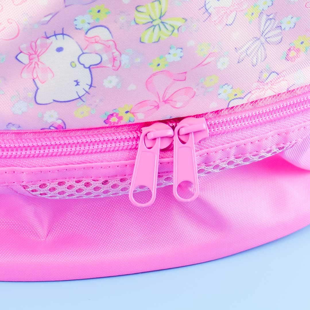 This super cute multi-strap bag featuring Hello Kitty with ribbons and flowers is perfect for carrying around your essentials. It features a lower mesh compartment with a zipper closure. You can carry it like a handbag with its upper straps or you can wear it like a backpack. Close the bag by pulling on the drawstrings on top!