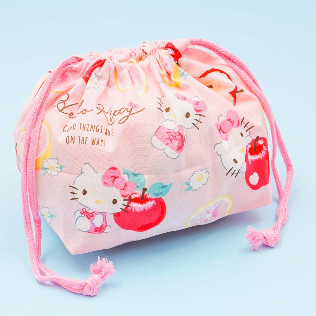 • A kawaii drawstring bag that has prints of Hello Kitty with large grapefruits and apples