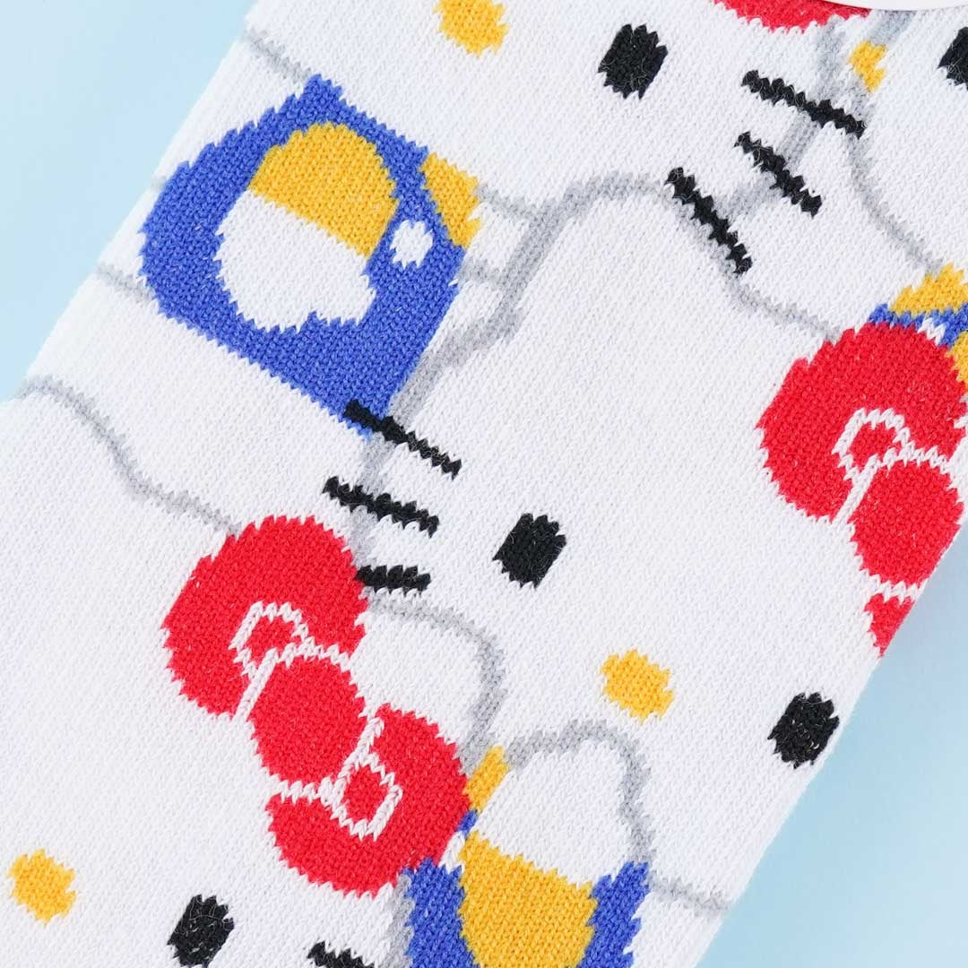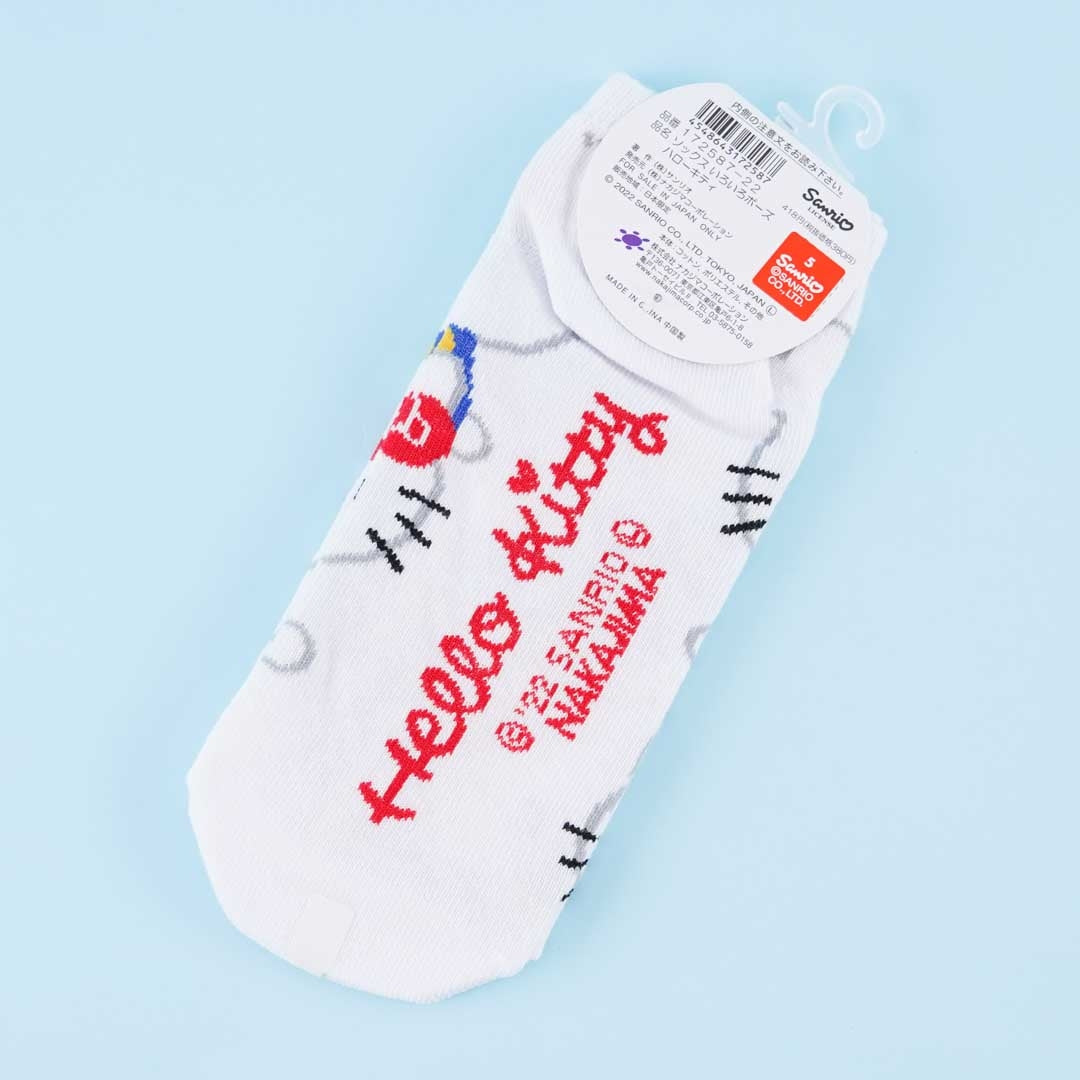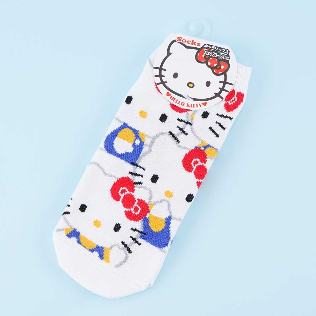 A pair of kawaii socks with illustrations of Hello Kitty’s various face angles