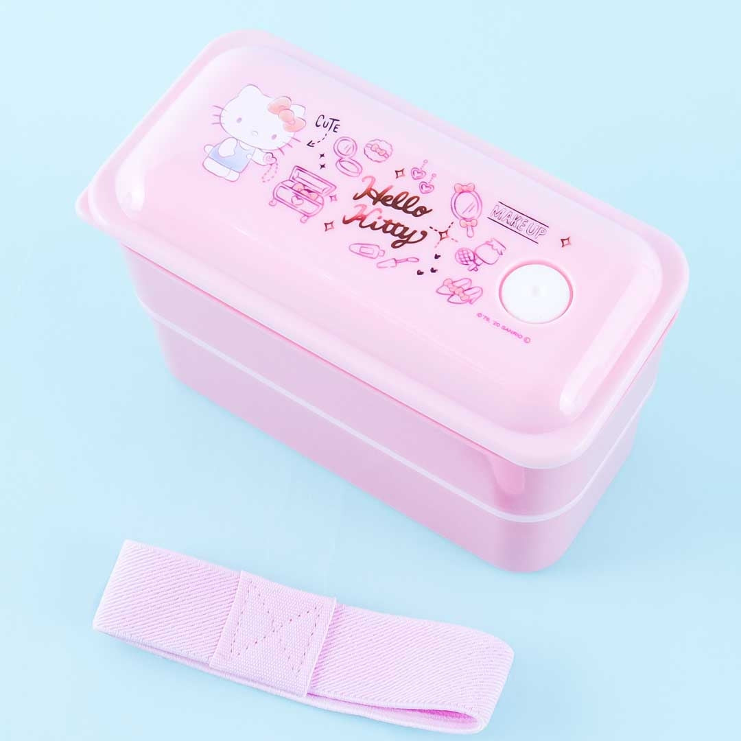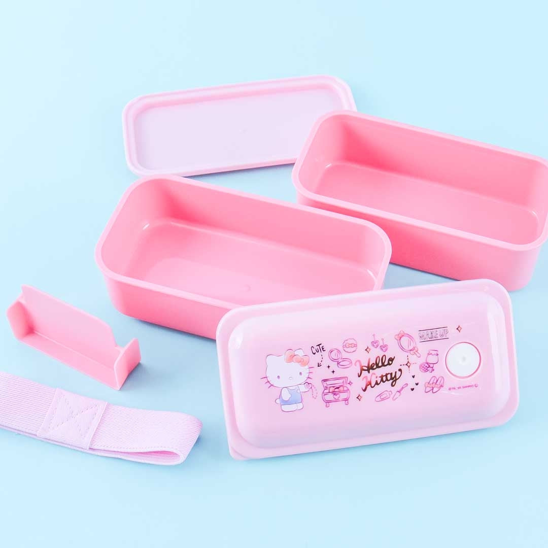 • A lunch box set with an illustration of Hello Kitty with her collection of jewelry and makeup