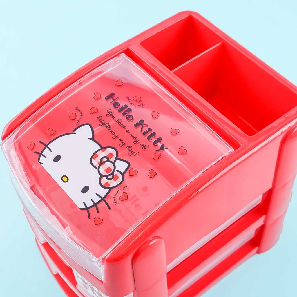 Organize your important jewelry and ornaments with this storage case! It features super cute illustrations of Hello Kitty. This chest box made from durable resin has two secured drawers with stoppers and three upper sectioned containers for more storage!