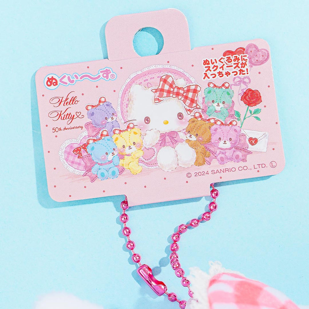 Add this super kawaii Hello Kitty plushie with dreamy eyes to your stuffed toy collection. It comes from the Sanrio Nukuzui series! This cute medium-sized plush was made in celebration of Hello Kitty's 50th anniversary. You can attach it to your bag with its removable ball chain.