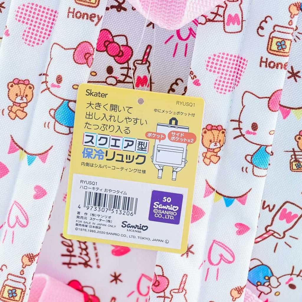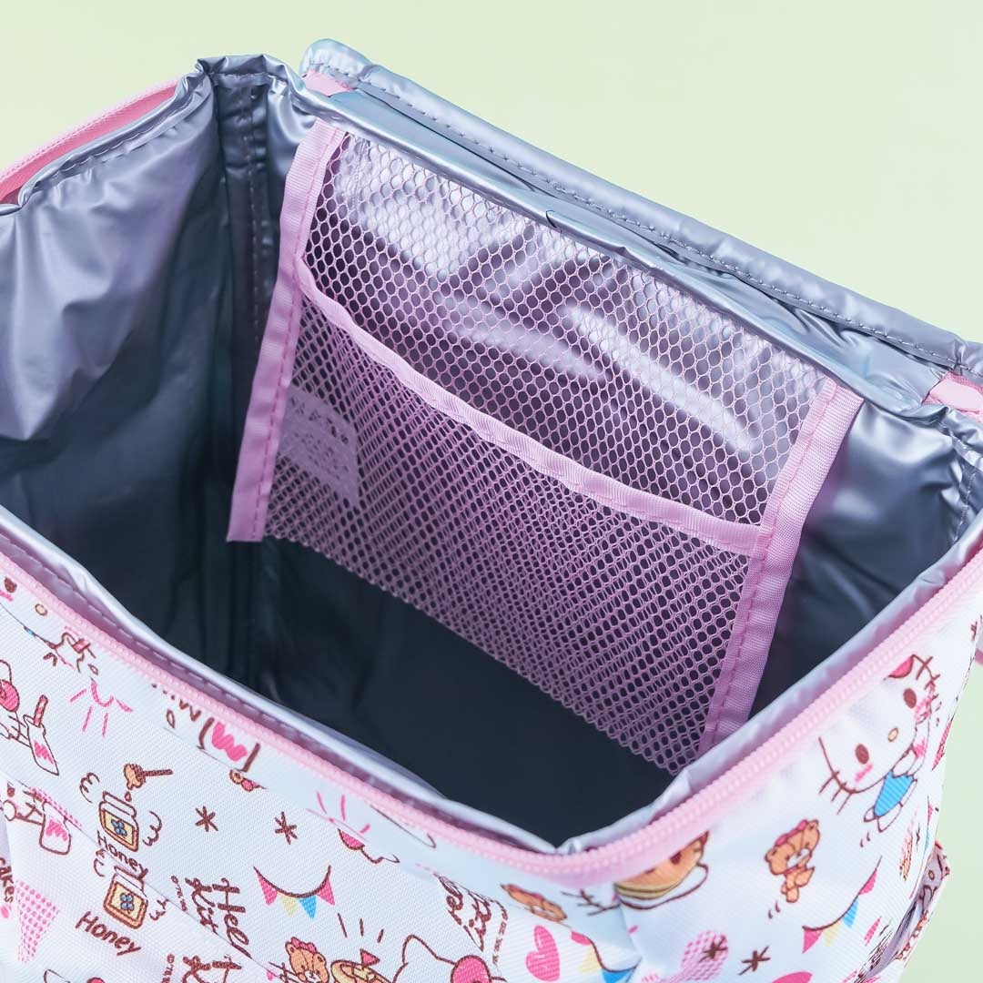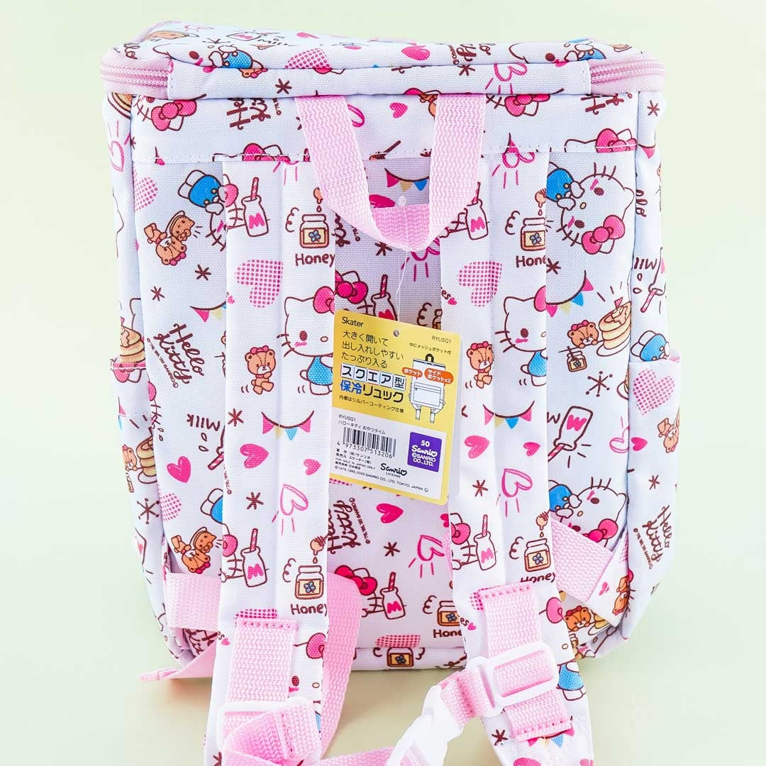 A cute rectangular backpack featuring prints of Hello Kitty and pancakes