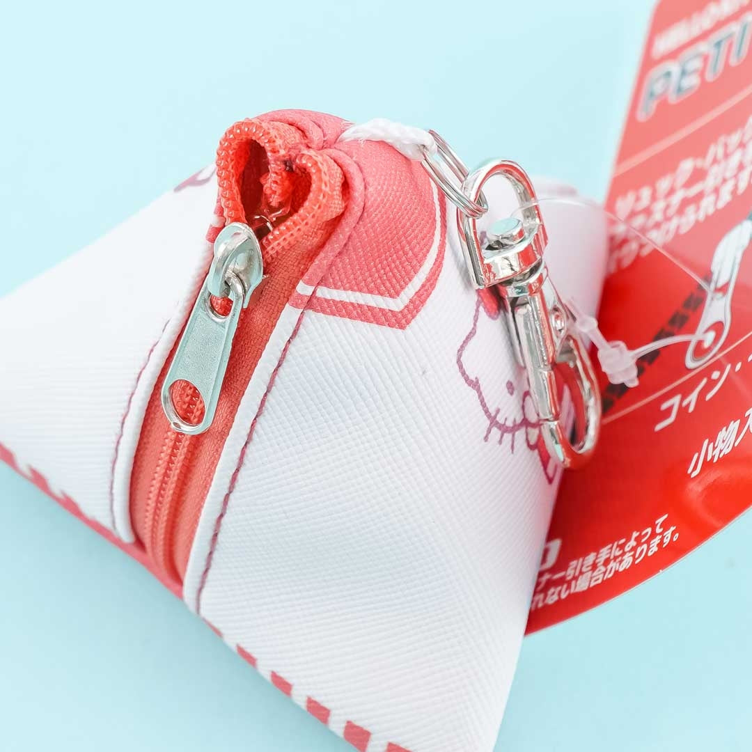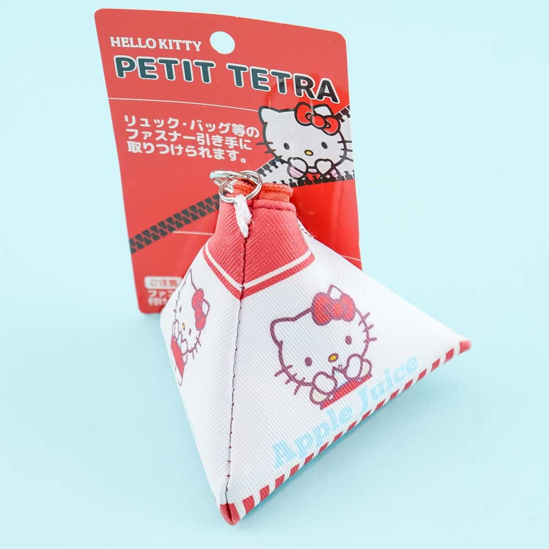 A kawaii small triangle purse with prints of Hello Kitty holding a tetra juice pack