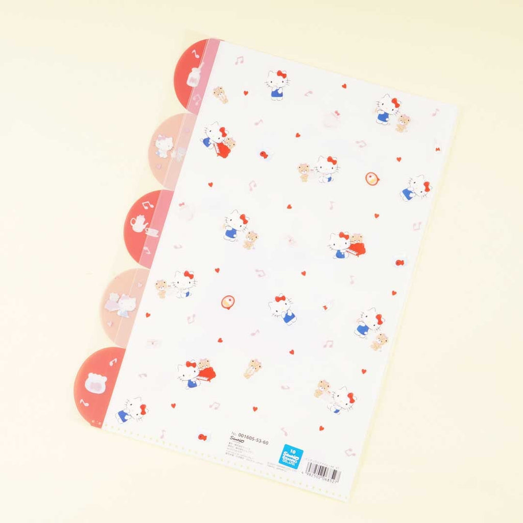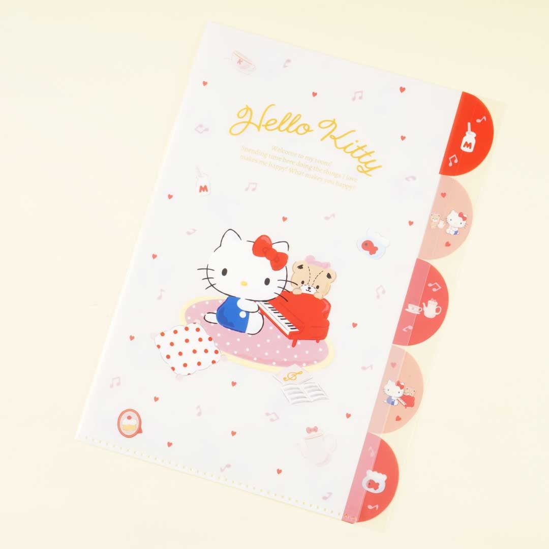 Organize your valuable documents inside this kawaii index folder with five slots and matching right-side curved tabs! Its cover features illustrations of Hello Kitty playing songs on a red grand piano! This A4-sized file folder is made of semi-transparent plastic.