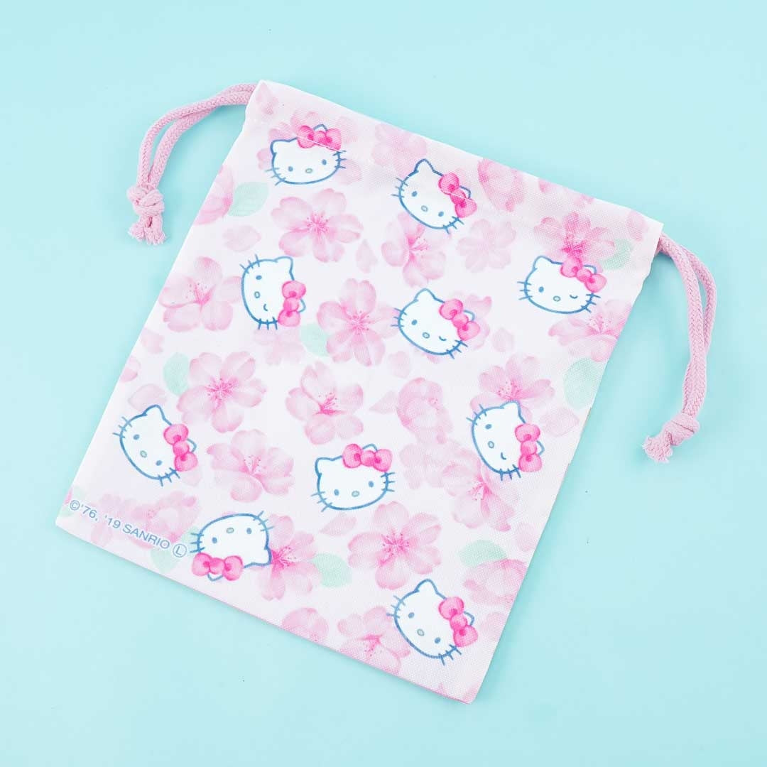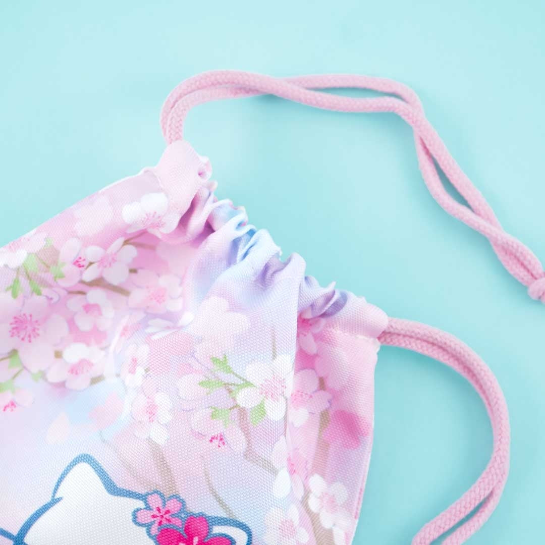 • A super cute drawstring pouch illustrated with Hello Kitty enjoying the sakura season