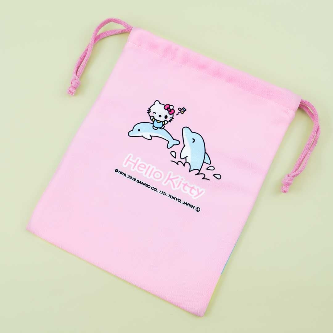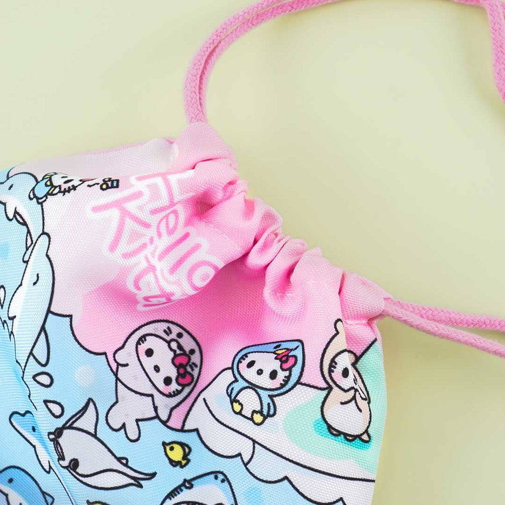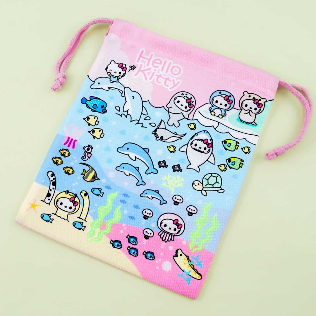 A super cute drawstring pouch featuring prints of Hello Kitty playing with sea friends