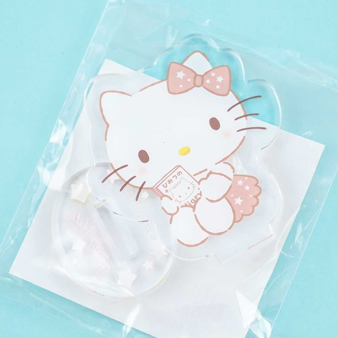 A kawaii die-cut 2D acrylic stand illustrated with Hello Kitty holding diary