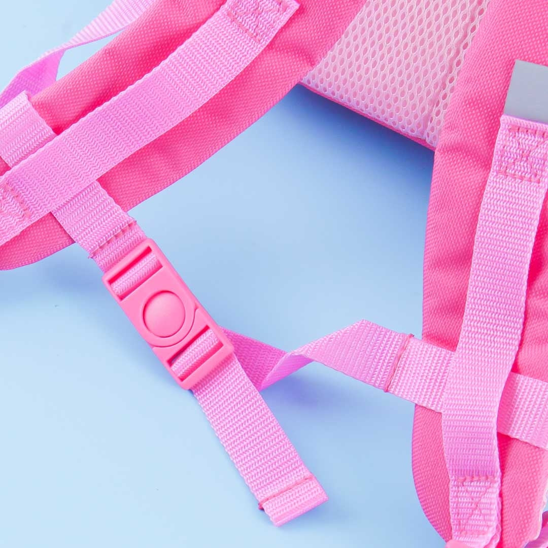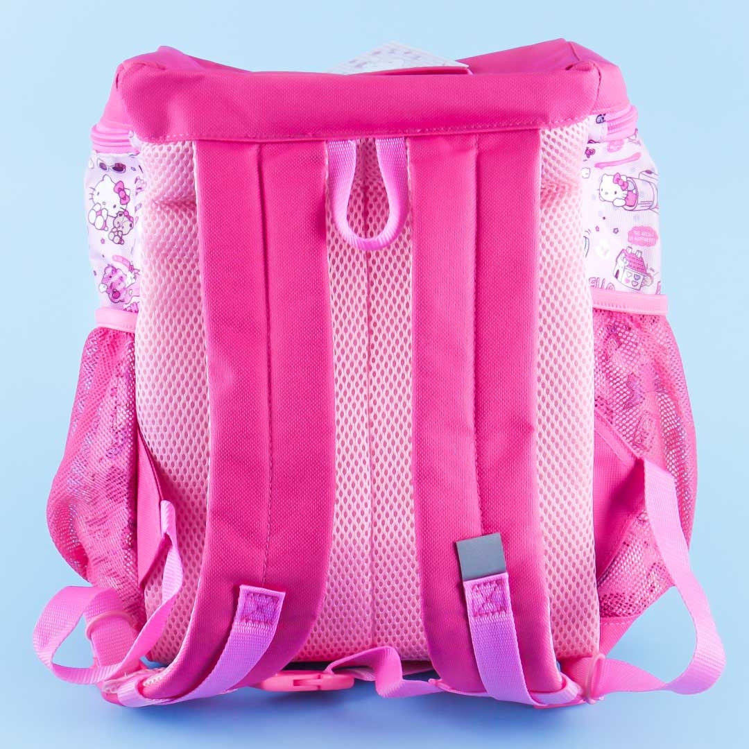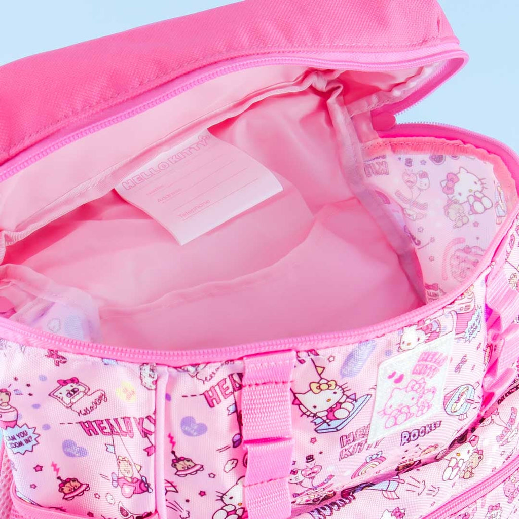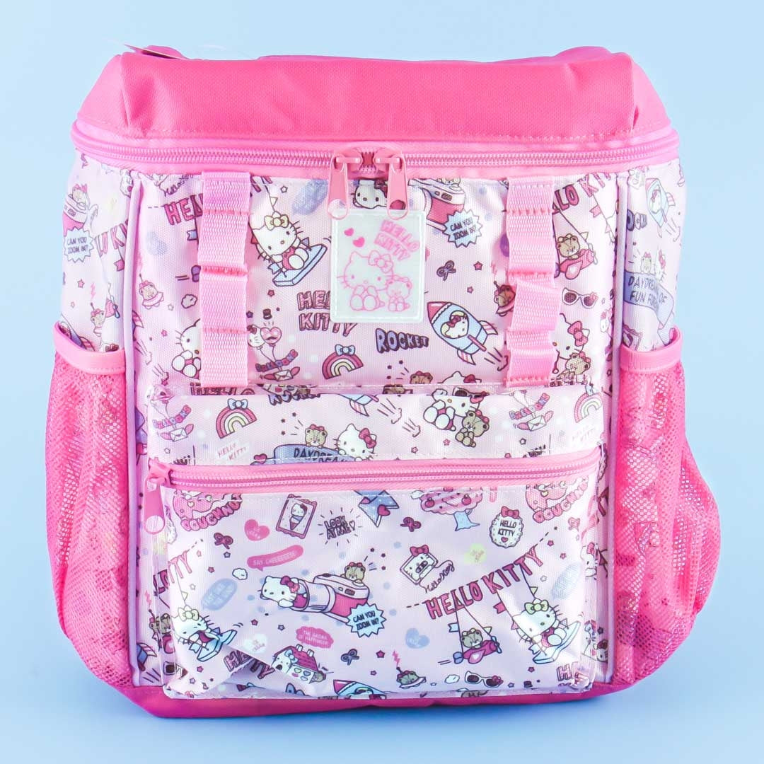 A rectangular backpack featuring Hello Kitty, rockets, swings, and rainbows