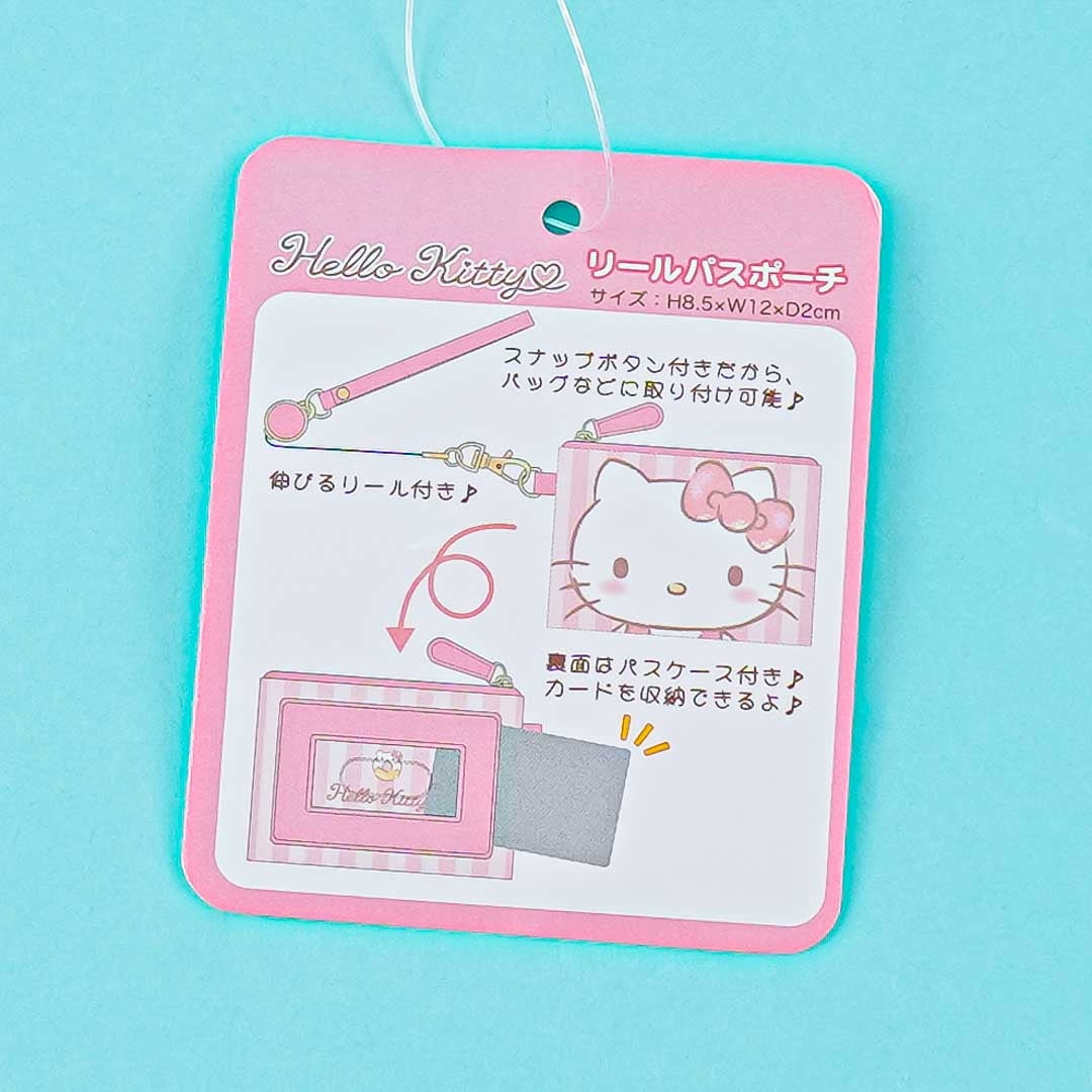 Store your train card inside the special slot on the back of this cute synthetic leather coin purse! It’s decorated with stripes and a print of Hello Kitty! This zippered case also has a handy removable strap that has an extending reel attached to it.