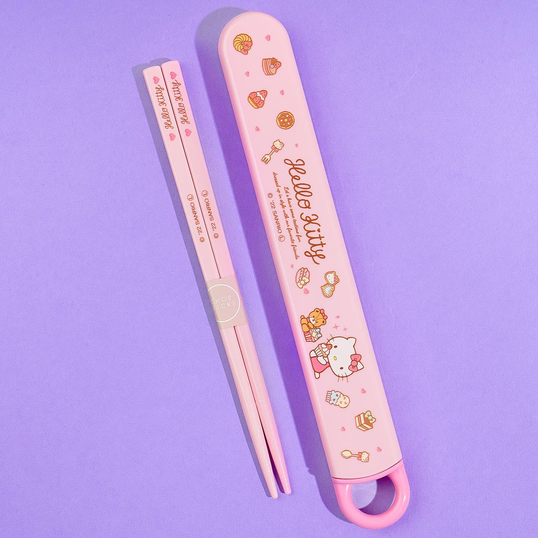 This kawaii pair of chopsticks is perfect for your school lunch! It features cute illustrations of Hello Kitty with desserts and a space where you can write your name. The chopsticks come in a matching plastic case with a sliding lid for easy storage.