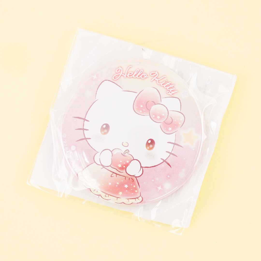 Pin this cute badge to kawaii-fy your favorite bag. It's decorated with a print of Hello Kitty holding an apple while wearing a cute dress! This badge also has a fun twinkle design.