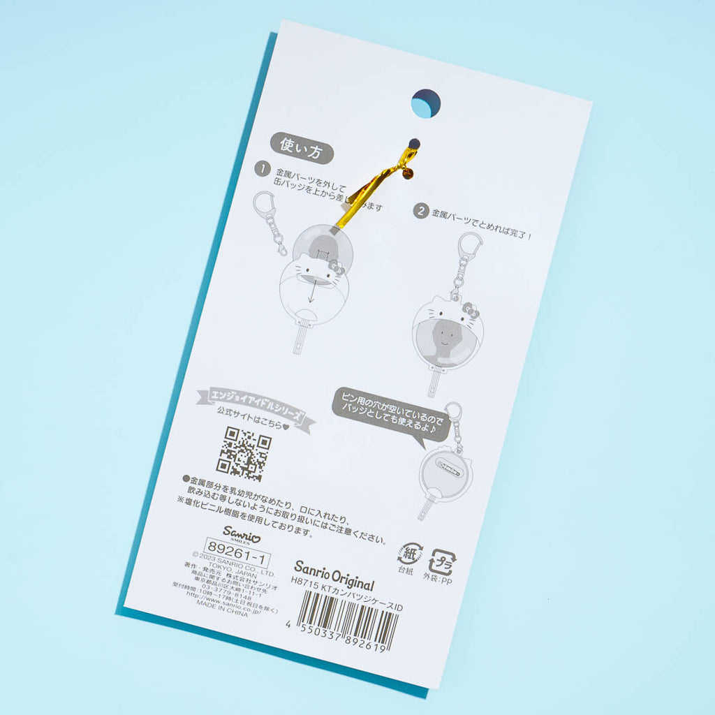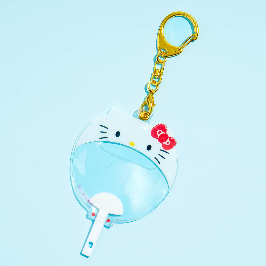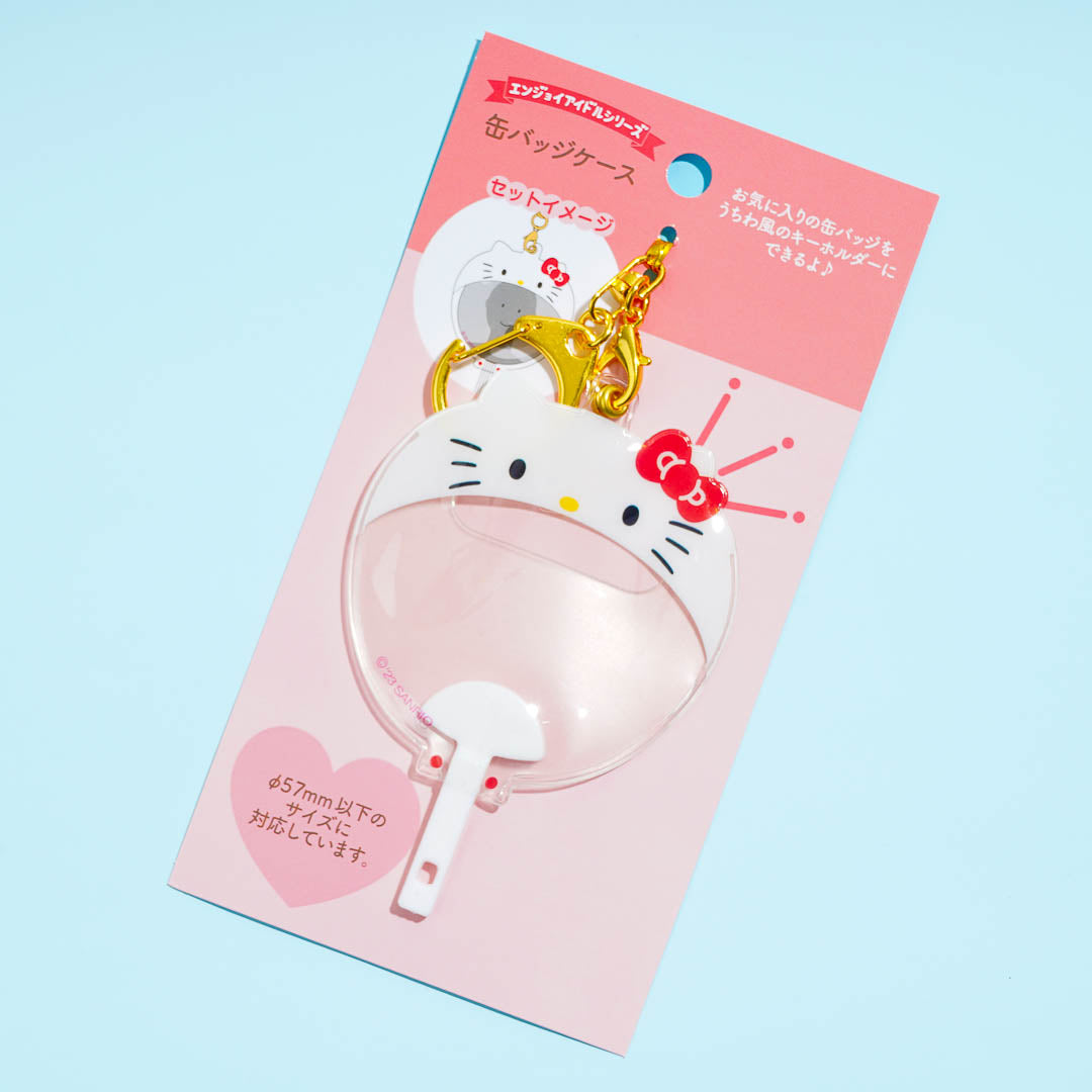 This can badge case features Hello Kitty's cute face in the shape of an uchiwa fan! You can place your can badge inside to make it look cuter and turn it into a keychain using the removable metal hook.