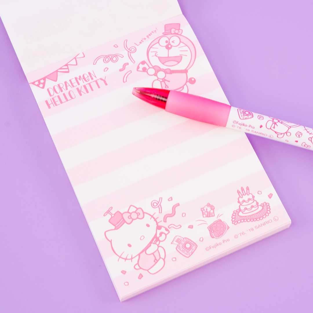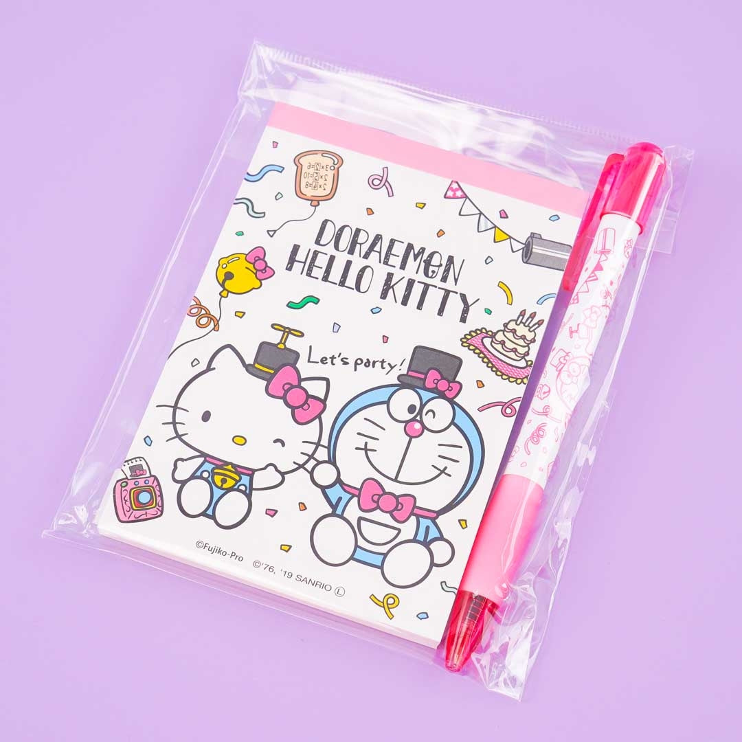 A kawaii notepad and pen kit featuring Hello Kitty and Doraemon having a party