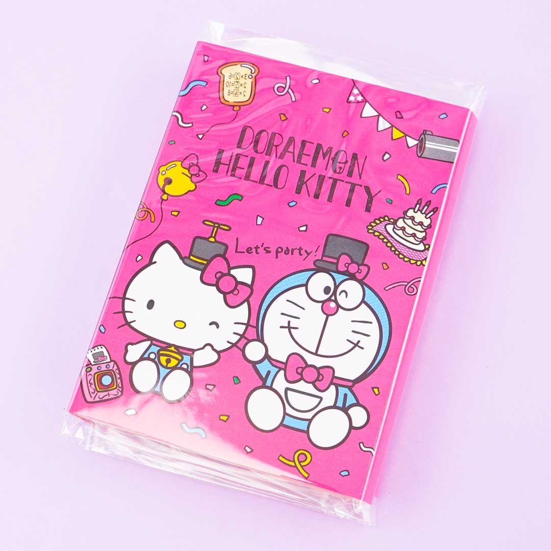 A super cute memo pad set featuring prints of Hello Kitty and Doraemon partying together
