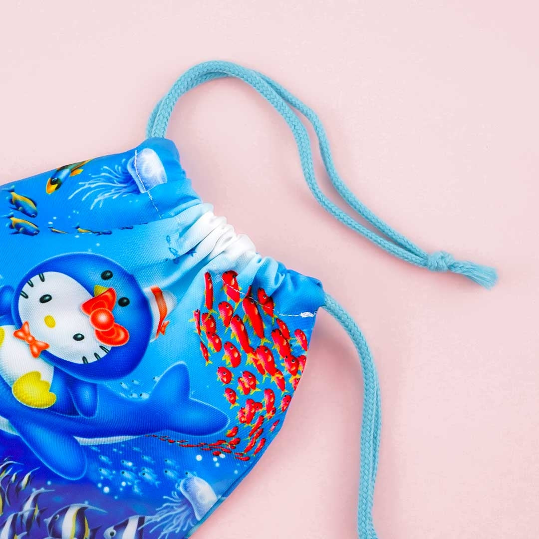A super kawaii drawstring pouch illustrated with Hello Kitty in a Tuxedosam onesie riding a dolphin