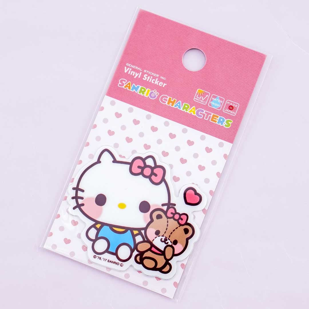 A die-cut sticker with a kawaii illustration of Hello Kitty, Tiny Chum, and a heart